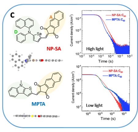 For example, recent work of our group together with Samsung Advanced Institute of Technology has investigated the role of molecular planarity on co-evaporated bulk heterojunction OPD light intensity dependent photoresponse times. While planar MPTA:C60 blends show faster response times at relatively light intensities, twisted NP-SA:C60 blends are favoured at relative low light intensities. Using ambient photoelectron spectroscopy (APS), the origins of the intensity dependent behaviour in blends with planar MPTA donor are attributed the higher density of relatively deep trap states in planar MPTA donor blends which become increasingly detrimental under low-light operation. In contrast, the twisted NP-SA donor maintain light independent photoresponse times due to their comparatively low deep trap state density [1].