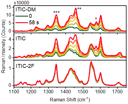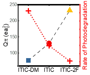 Our work has also been fundamental in understanding the molecular origin of photodegradation in non-fullerene acceptors (NFAs) for OPV applications. For example, by using resonant Raman spectroscopy in conjunction with DFT simulations it is possible to identify which conformational changes of the molecule are responsible for degradation in addition to the degradation product itself. In a recent systematic study of ITIC derivatives, a strong correlation between molecular charge distribution (characterised by the molecular quadrupole moment) and NFA photostability was demonstrated due to differing intermolecular interaction strengths. In this study we were also able to identify factors that influence the magnitude of the quadrupole moment [2].