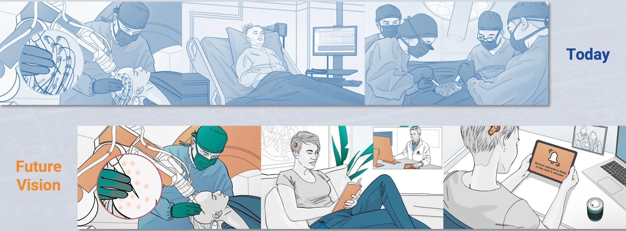 There is currently no escaping the need for electrodes and wires to be inserted into the brain, however, our vision in the future is to connect each of these electrodes to a small microchip implanted under the skin. This small change enables a fundamental difference for the patient: the clinician can close up the skin after implantation, greatly reducing the risk of infection and greatly increasing the potential recording time. We will also create a small wearable device that wirelessly receives data from the implanted microchip(s), untethering the patient, enabling them to leave not just the hospital bed, but the hospital itself, and to return to their daily life for the monitoring period.