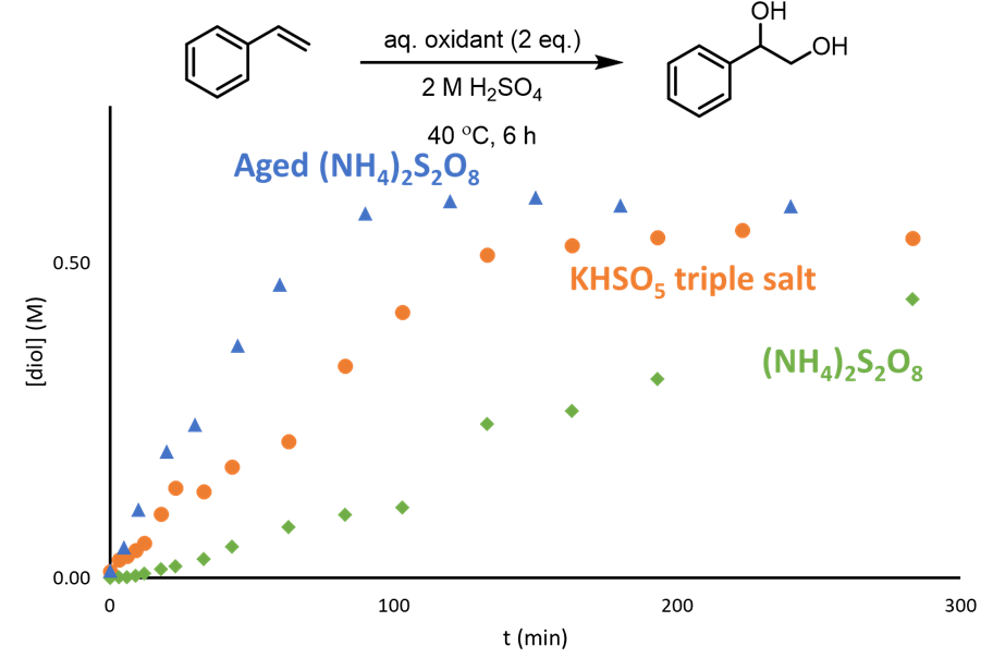 Whilst investigating the dihdroxylation of alkenes to vicinal diols by electrochemically generated ammonium peroxydisulfate (PDS), Dr Ben Deadman, Prof. Klaus Hellgardt and Prof. Mimi Hii observed that the reactivity of the oxidant increased after it had been aged overnight (Figure 1). This change in reactivity led the team to hypothesise that the active oxidant was actually the peroxymonosulfate (PMS) which would be generated in situ by the decomposition of PDS under acidic conditions.