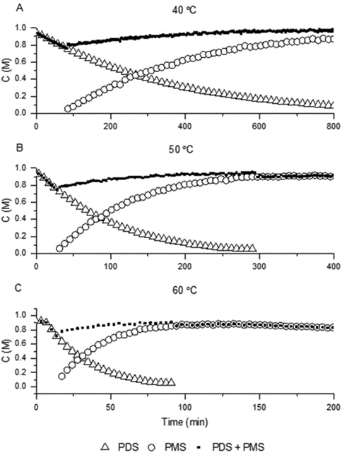 The team used the orthogonal IR and redox colorimetric methods to monitor the decomposition of PDS into PMS in acidic solutions at 40, 50 and 60 °C (Figure 3). Once formed, the PMS was observed to be remarkably stable at up to 50 °C, but increasing the temperature further led to the competitive decomposition of PMS to H2O2. Monitoring the reaction by IR also revealed the presence of a further intermediate through the delayed onset of PMS formation (tracked by plotting the sum of [PDS] and [PMS]). The time course data was then employed by the team to build a pseudo first-order kinetic model of the reaction, and obtain rate constants and an activation energy for the reaction process.