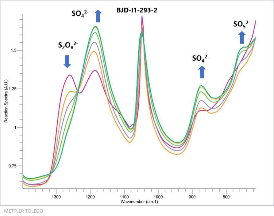 To confirm their hypothesis the team utilised a combination of the Mettler-Toledo ReactIR 15 and their bespoke redox colorimetric analysis method (React. Chem. Eng., 2017,2, 462-466) to follow the conversion of PDS to PMS under acidic aqueous conditions. The formation of PMS could be followed directly by the diagnostic IR absorbance at 760 cm-1 while the loss of PDS could also be followed by the IR absorbance at 1260cm-1 (Figure 2).