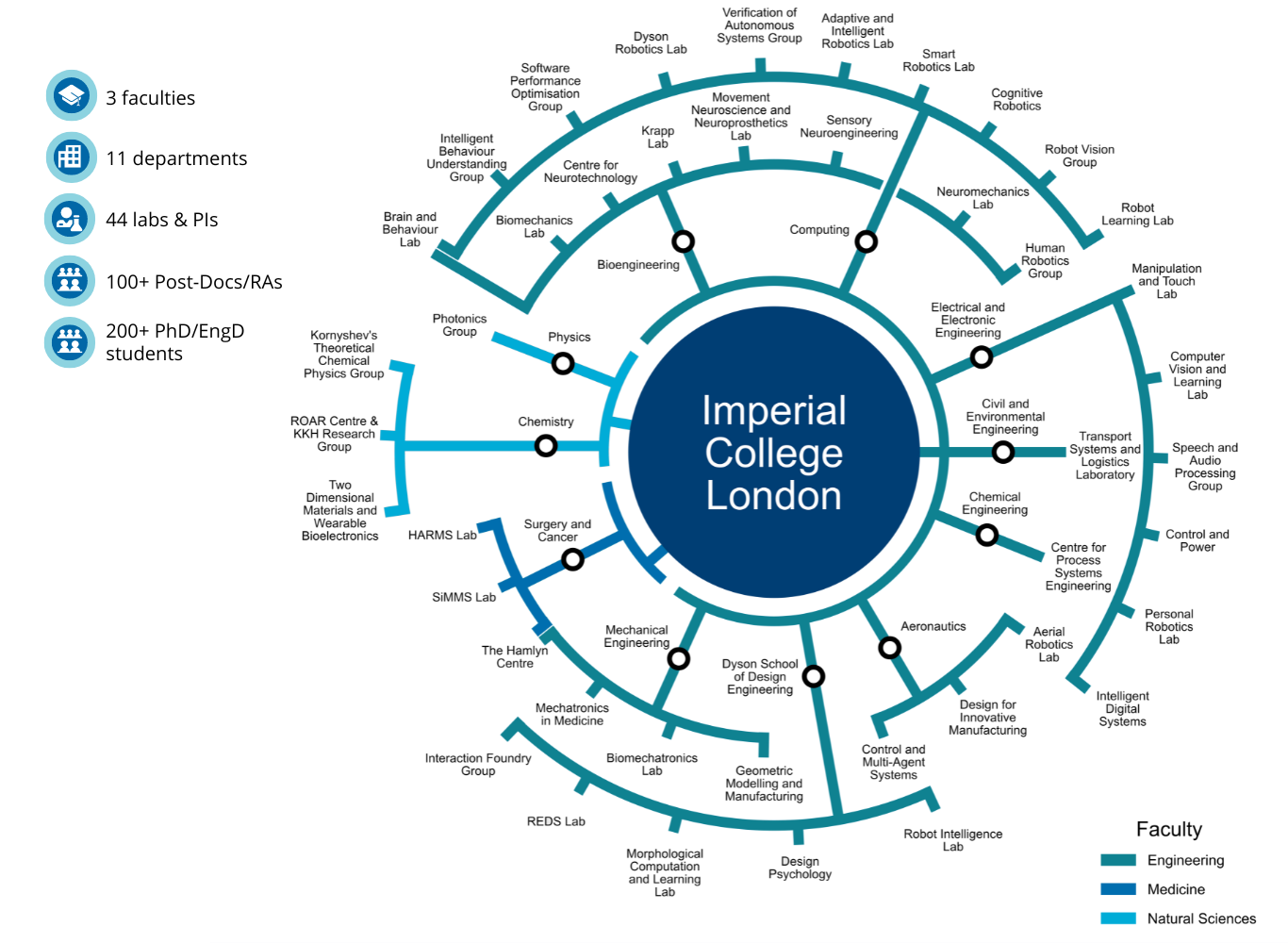 The Robotics Forum is a network of excellence at Imperial College London, founded in 2015. It connects 40+ principal investigators pursuing cutting-edge research in robotics from across multiple departments and faculties. Over the years, the network has collectively generated over 2,400 publications, 64 patents, and secured over £150M in funding. It employs 100+ post-doctoral research associates and research fellows, and oversees more than 200 PhD and EngD students. Its research has led to the creation of 16+ companies and benefits from 50+ ongoing industrial partnerships.