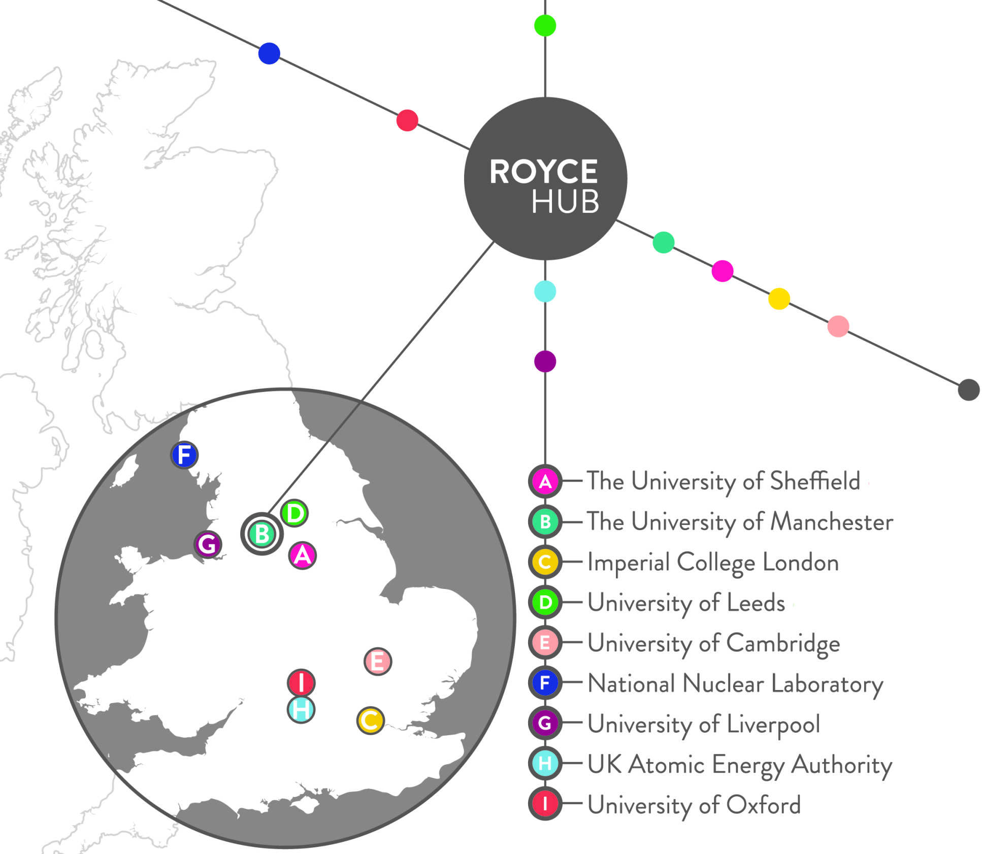 The Henry Royce Institute operates as a hub and spoke model, with the hub at The University of Manchester and spokes at the founding partners.