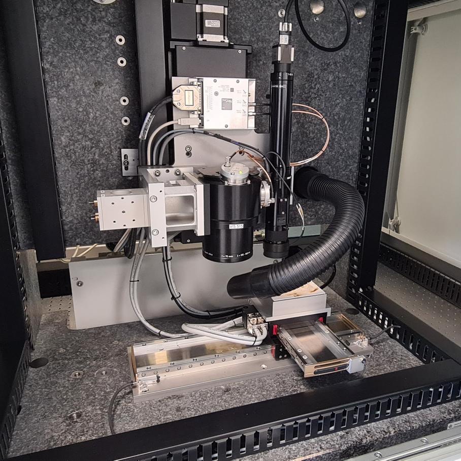 The system has a Coherent Monaco laser with dual wavelengths (515nm and 1030nm). The x, y stage allows for a precision of 1µm repositioning while the laser spot can be focussed at 8µm. This allows for the engraving and cutting of thin film, silicon wafer, metal, polymer and oxide.