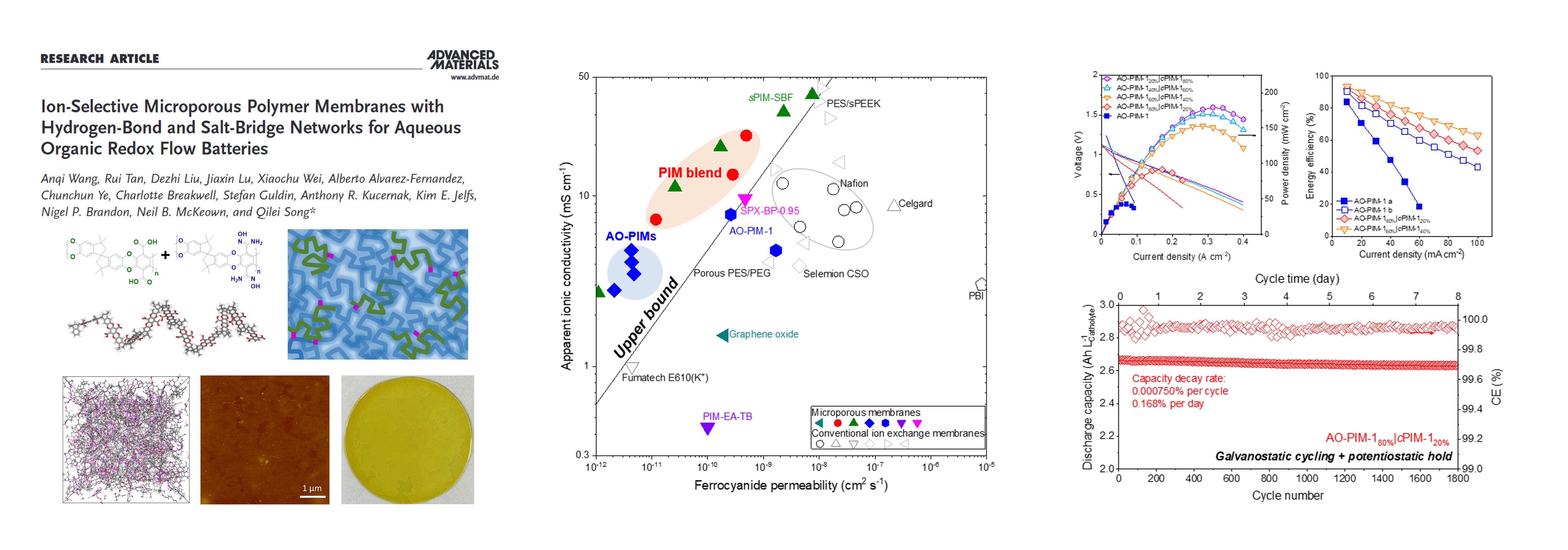 Our latest paper on ion-selective PIM membranes for aqueous organic flow batteries for energy storage. Great work led by Dr Anqi Wang, and collaboration with teams across Imperial, UCL, and Edinburgh. Link to the paper: https://onlinelibrary.wiley.com/doi/full/10.1002/adma.202210098