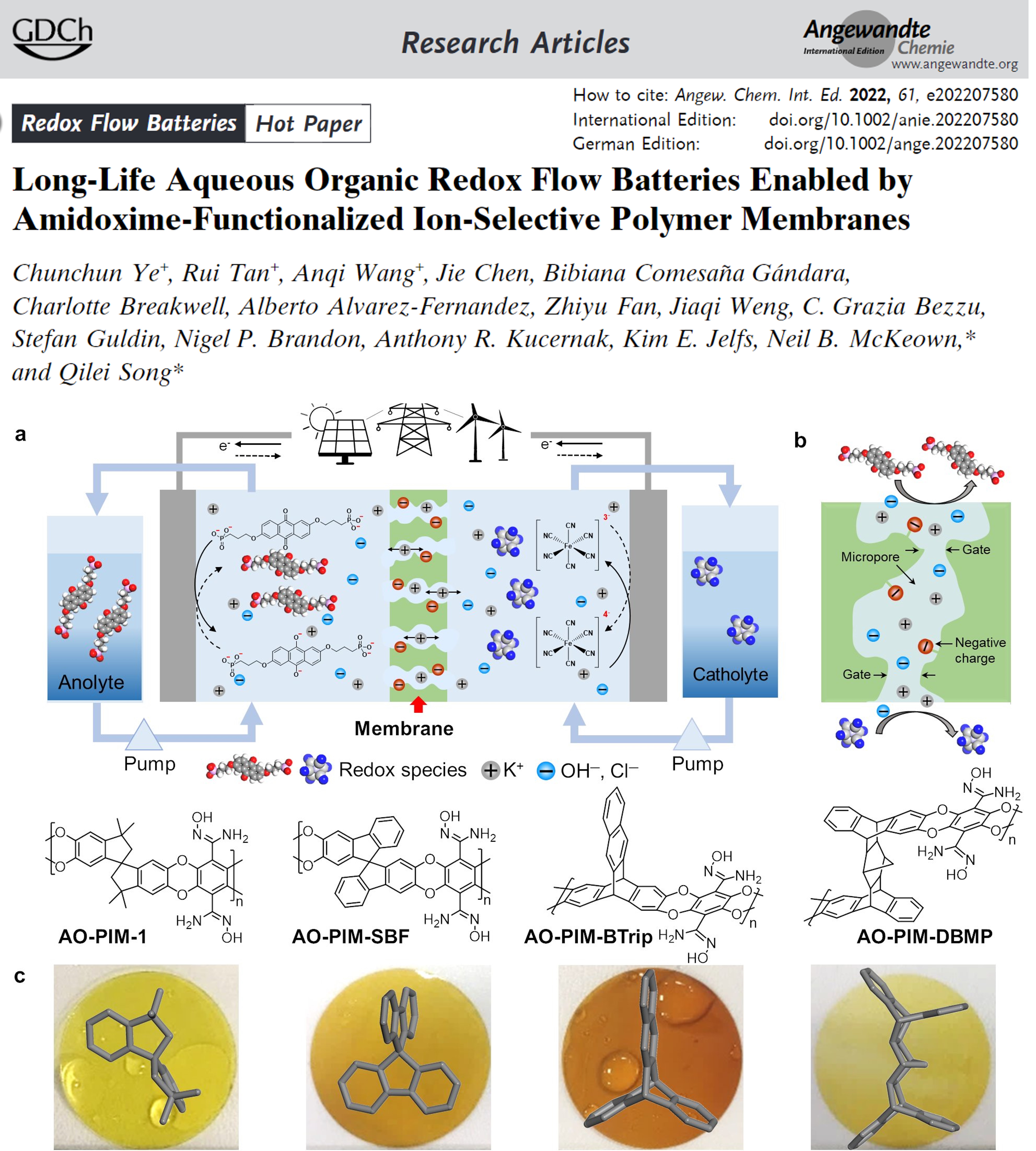 New paper published in Angew Chem Int Ed. We reported the application of amidoxime-functionalized PIM polymer membranes for aqueous organic redox flow batteries. Great teamwork with teams across Imperial, Neil McKeown Group, and Stefan Guldin Group at UCL.