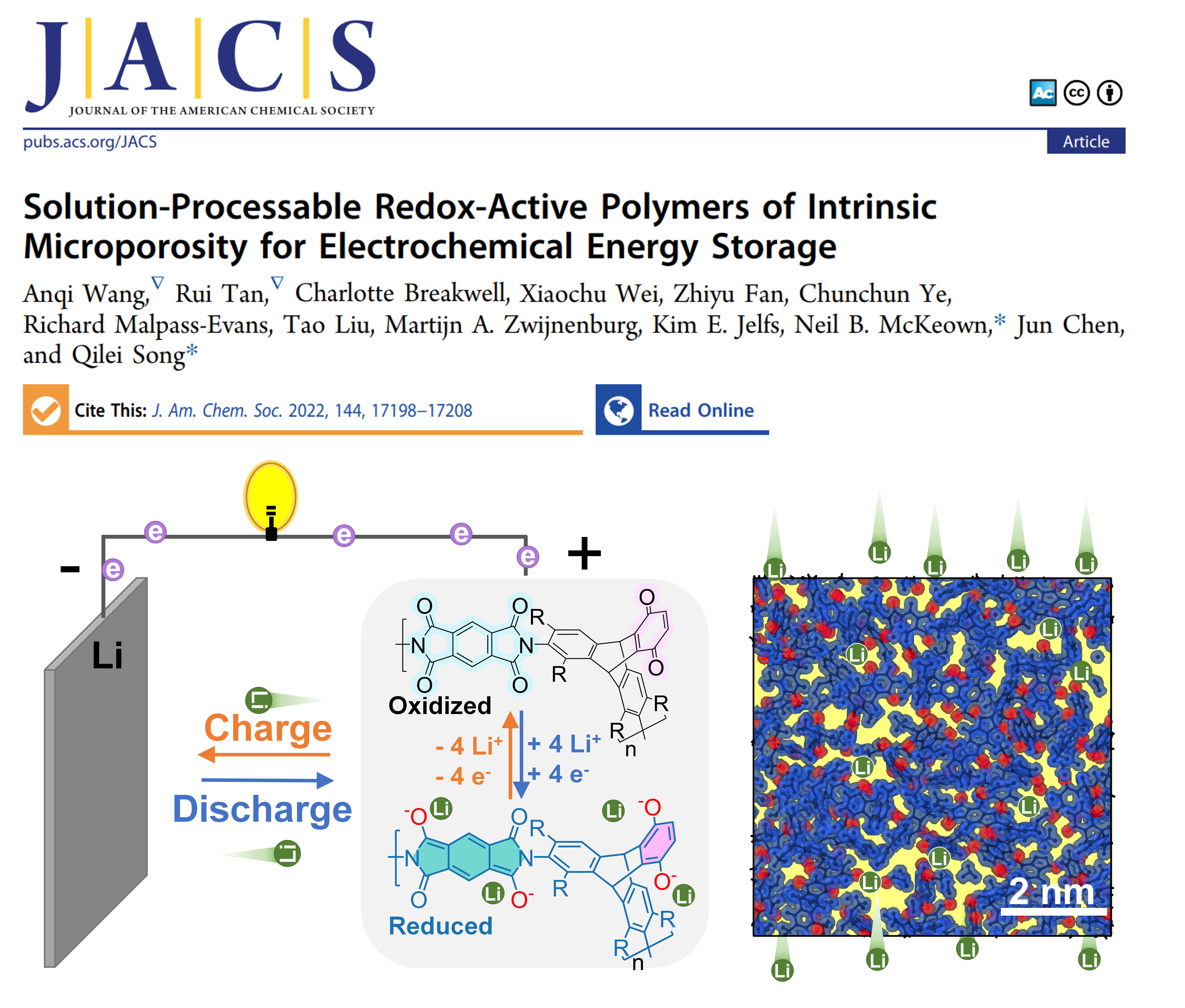 Our new research article has been published in JACS. We reported the development of redox-active PIM polymers and their application as organic electrode materials in lithium-ion batteries. Amazing collaboration work led by postdoc researchers Dr Anqi Wang and Dr Rui Tan, with molecular modeling by Charlotte Breakwell (MRes project) supervised by Prof Kim Jelfs and Prof Martijn Zwijnenburg, and collaboration on the molecular design of redox PIM polymers with McKeown Group at Edinburgh. This paper involves collaboration between our group with collaborators in 5 chemistry depts at Imperial, UCL, Edinburgh, Nankai University, and Tongji University. A truly interdisciplinary collaboration between Chemical engineers with chemists, from synthesis to battery manufacturing.