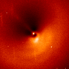 (Right) An animation of the region surrounding the nucleus of Comet Hyakutake for several hours on April 1/2, 1996. The sequence was obtained using the 0.6m Radcliffe Telescope at the University of London Observatory, by Geraint Jones (then of the Mullard Space Science Laboratory), and Steve Fossey of the University of London Observatory. The nucleus (which can't be resolved on this scale) is at the centre of the image. The Sun was towards the lower right. Curved jets dust can be seen leaving the sunward side of the nucleus. Short vertical lines are background stars. Bright points are cosmic ray hits on the CCD detector.