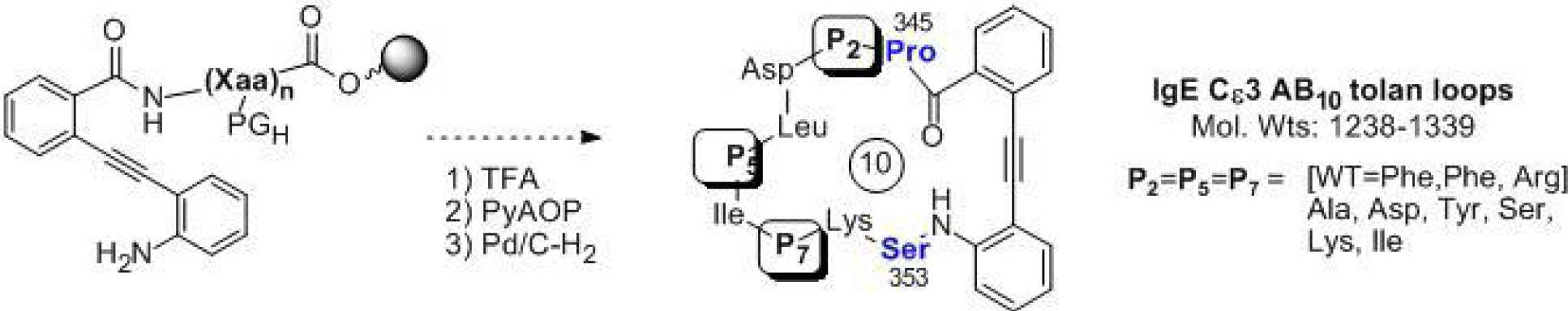 Various disulfide looped peptides containing the receptor binding epitopes are antagonists of the interaction and elicit the production of antibodies which inhibit the binding of IgE to the receptor but do not activate IgE sensitised cells. As peptides generally lack the oral and cellular bioavailability required for therapeutic activity we are presently developing a series of non-peptide 'scaffold' molecules to replace the crude conformational constraint afforded by the disulfide bridge present in some of these peptide loops. Covalent attachment of the peptide binding motif to the scaffold should result in it being constrained into conformations which resemble that in IgE. Systematic site-specific 'synthetic mutagenesis' of these compounds should allow us to iteratively optimise the most promising compounds by imposing further conformational restraints on the peptide by way of residue replacements.