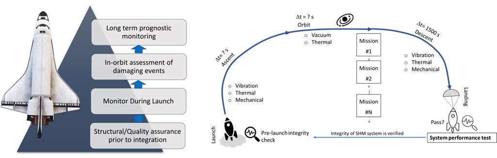 The objectives of this project funded by the European Space Agency (ESA) is to investigate the SHM application to vertical re-usable launchers (VRL) is to facilitate system re-use. Therefore the SHM system it must be able to provide information on material degradation mechanisms as well as the integrity of the structure and its safety for re-launch. The project is led by Fluid gravity, and the project partners are ICL (SI&HM group) and MT-Aerospace.