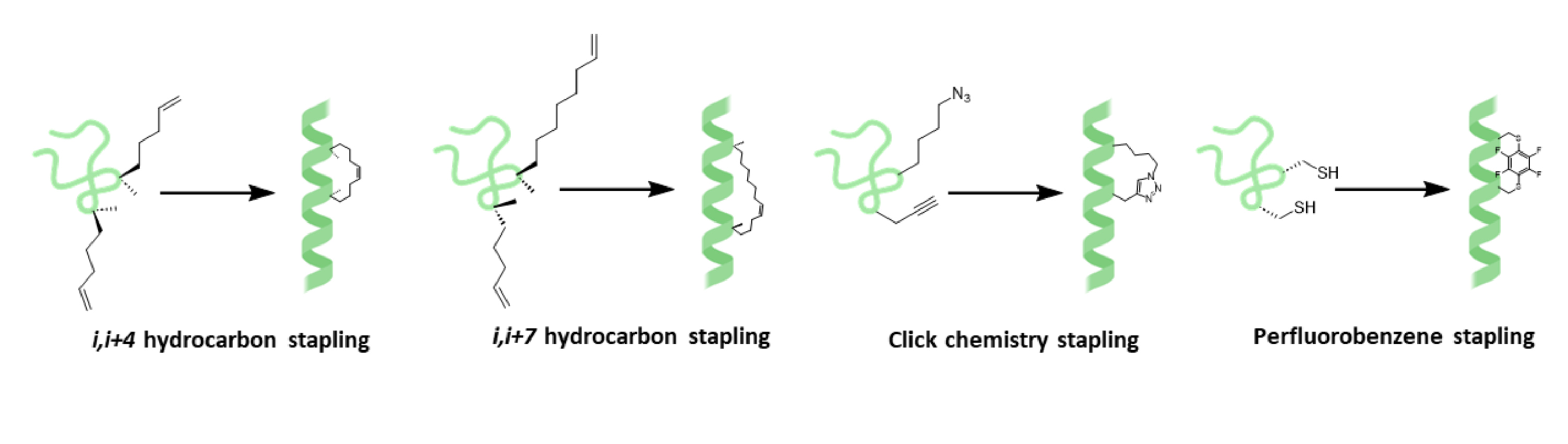 Protein-protein interactions (PPIs) represent a large class of disease-relevant molecular targets where the binding interface is often challenging to target with a small molecule. In such cases, peptides sequences that mimic a key portion of the interacting protein interface provide an important alternative but are subject to a key limitation: once separate from the whole protein a short peptide sequence no longer retains its (bioactive) conformation. A means to tackle this issue for helical peptides is using a synthetic peptide ‘staple’ which locks the peptide sequence into a bioactive conformation.