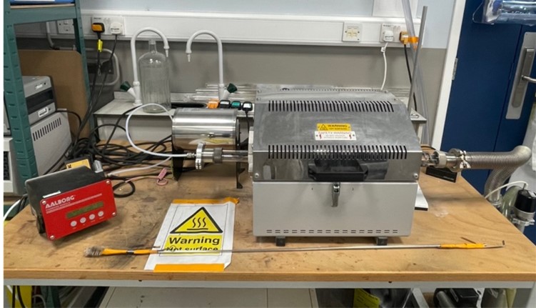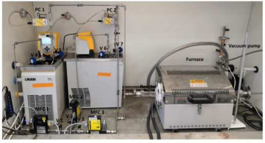 Horizontal CVD system works in a temperature range from 200-1050 °C, the flowrate of the carrier gas is monitored and regulated by the mass flow controller.