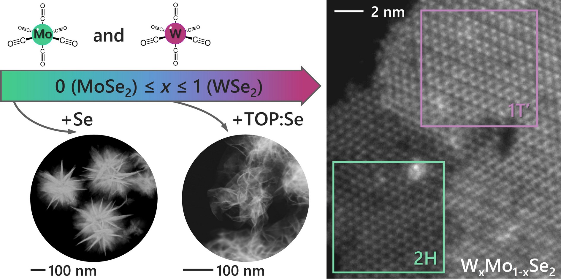 Precise Synthesis of 2D Materials in Solution: We investigate new strategies to synthesise solution processable 2D materials. Our research discovered how the crystal phase (WSe2, WxMo1-xSe2), chemical composition (WxMo1-xSe2) and faceting (Bi2Te3) of atomically thin functional materials can be effectively controlled in a solution phase reaction. Precise solution phase synthesis works towards engineering functional 2D materials where the properties, such as electronic and catalytic, have to be controlled at the atomic scale.
