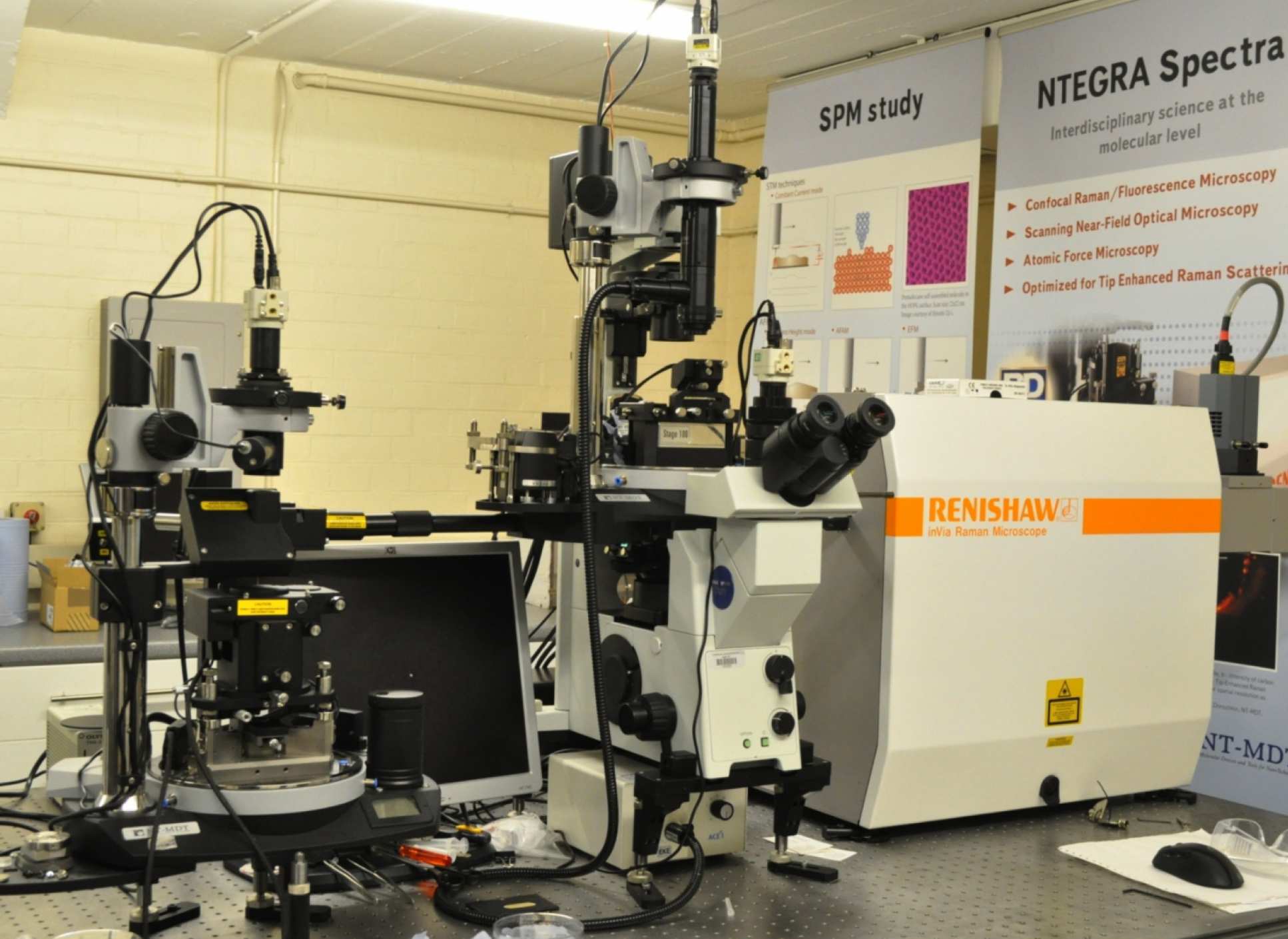 Our AFM/Raman system with upright and inverted microscope enable the phenomenon of tip-enhanced Raman to be exploited for a variety of samples, with laser illumination from the top or underside of the sample. The presence of the AFM tip near the sample surface within the beam of Raman laser gives an enhanced Raman signal from the tip, giving a spatial resolution well below the diffraction limit of the laser.