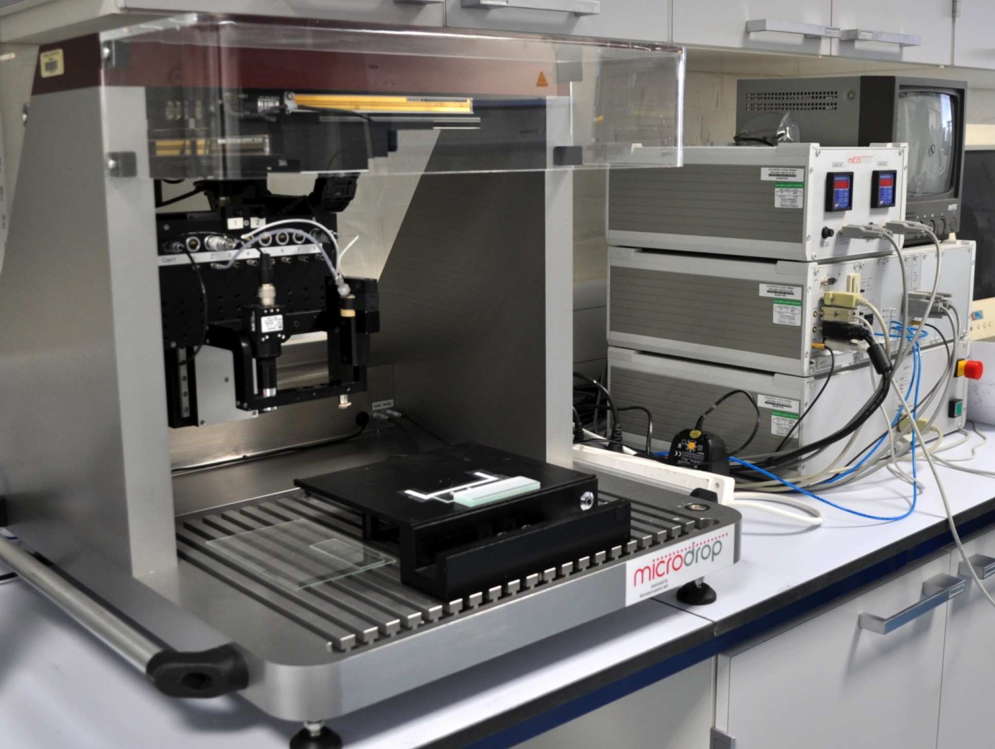 The microdrop device enables the deposition of small volume (approx. 110 pL) of liquid samples at precise locations. Liquids can be heated up to 160 ˚C and so this device can also be used to print wax patterns to create 3D micro structures.