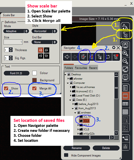 Select the right location to acquire images because the naming is image????.tif. To achieve that pick the folder where you want to save the images in the Navigator palette. Then set the location by clicking on the third icon in the bar above. The selected folder is now the default until changed. Many people will probably want to save images to their Imperial Windows share, a.k.a H drive.