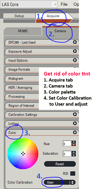 To get rid of the annoying colour tint, go to Acquire -> Camera -> Color and select User for Color Calibration.