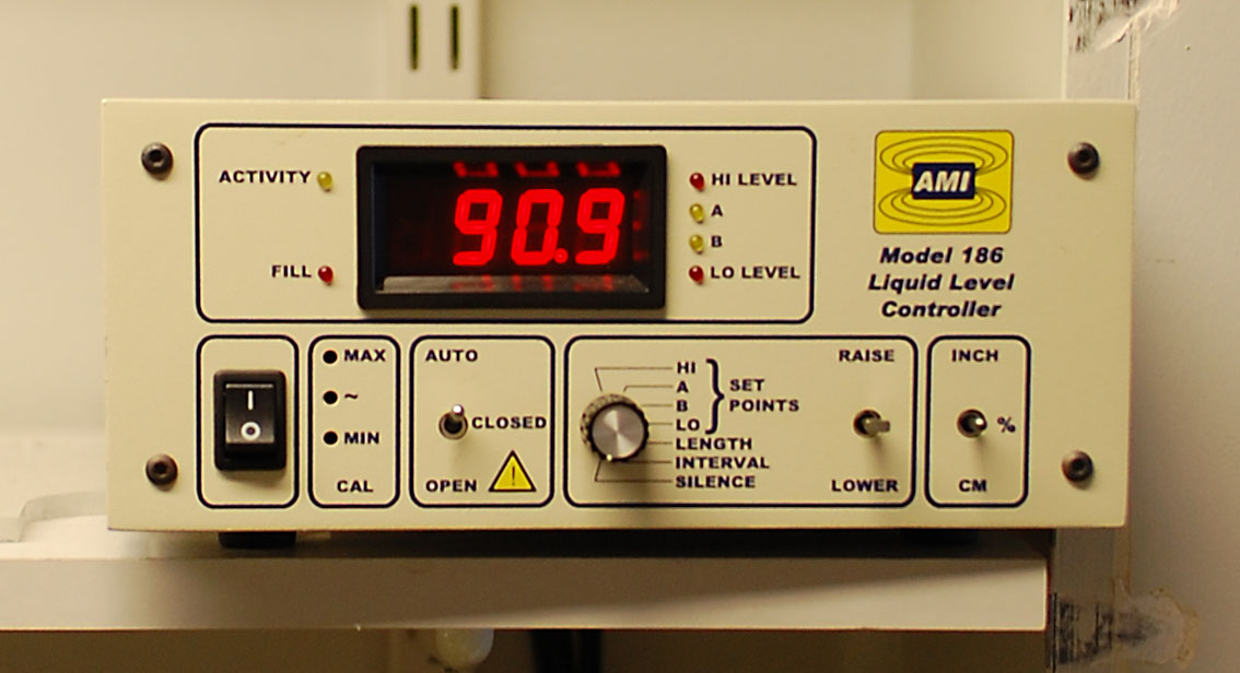 The autofiller control unit shows the fill level of the connected filling Dewar in per cent. With the mode switch in AUTO, the control unit will activate a solenoid valve to start filling from the 160 l pressurized vessel when the fill level drops below 30% (set point B). It will fill until 80% is reached (set point A). HI and LO on the turn knob indicate the high and low alarm. None of this should be changed during normal operation.
