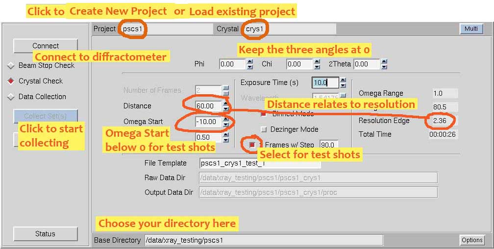 Choose a data directory by clicking into the box next to Base Directory. The path should be /data/<your_name>. Then choose data collection parameters as shown below. If you collect 2 Frames w/ Step 90, Omega Start must be below 0°.
