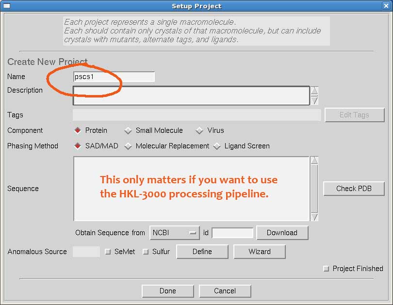 Define a new project or choose an existing one by clicking in the box next to Project. This brings up the dialog below. All you have to do is give a name. Sequence or a pdb file are only required if you want to have HKL-3000 solve the structure automatically. Click Done and define the crystal by clicking next to Crystal. Don't forget to save the project in your directory in /data.