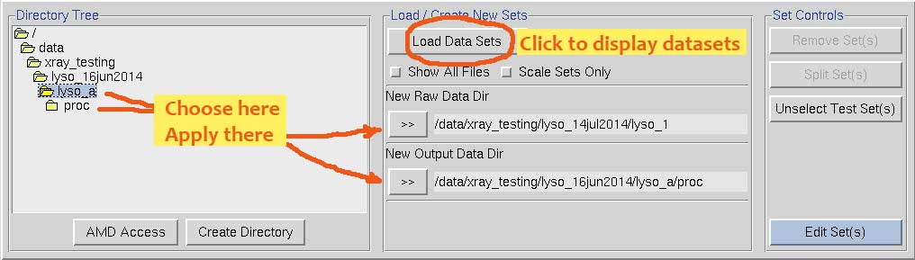 Go to the Data tab. If you've just collected, the data are loaded already. If you want to process old data, select the data and processing directories as shown in the figure below. Clicking Load Data Sets gives you a list of dataset in the chosen directory. Pick those that you want to process in one go.