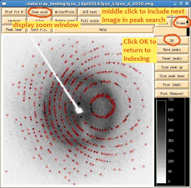 Upon clicking Peak Seach the image will be shown in a separate window. The red circles indicate identified peaks. There should be at least 100. If very few peaks have been found, you can increase that number by hitting Edit P.S. and then More peaks in the panel on the right. Confirm with OK. You can also use more images for peak finding and then index on a range of images.