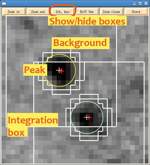 Middle clicking the image redefines the center of the zoomed region. Predictions are indicated by circles. Red means overlap and is bad. Yellow is good. The integration boundary is defined by the inner ragged circumference. The big square minus the outer circumference defines the background. It should be about three times as wide as the spot.