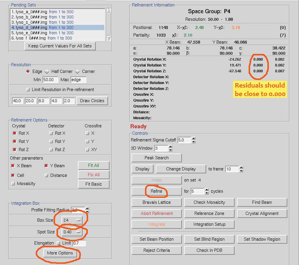 As shown in the figure below, adjust the values of Spot Size and Box Size. The background size can be adjusted, if necessary, through More Options. Hitting Refine refines the parameters selected on the left and updates the image window. Cycle through until the residuals are close to zero. The predictions should be on top of spots.