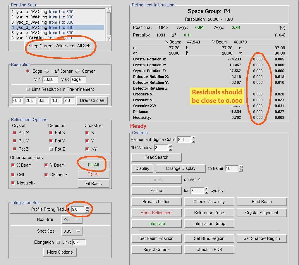 Now all parameters are fitted. Click Fit All as shown below and refine some more. All residuals should be close to zero. When you move the mouse into the image window, a circle is shown. This corresponds to the profile fitting radius. Wherever that circle is in the image, it should always have a few predictions inside. If that's not the case, increase the profile fitting radius as indicated in the figure below. Otherwise, profile fitting won't work reliably.