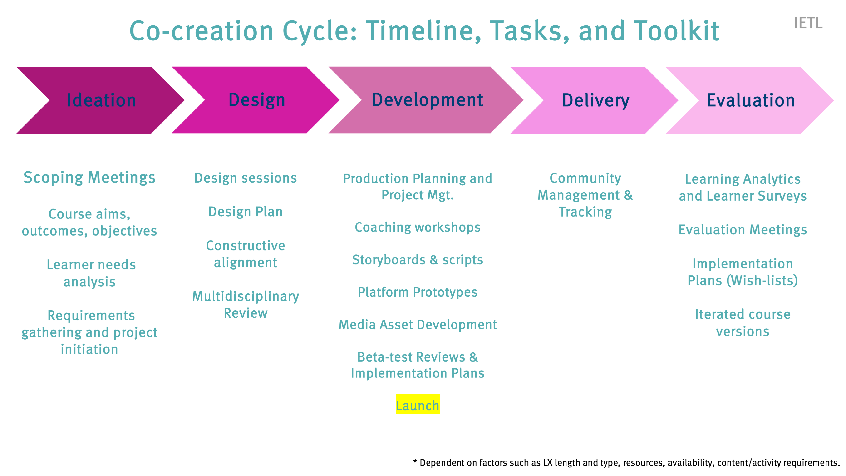 In the IETL, our approach is co-creative in nature and integrates instructional design methodology (e.g. ADDIE, Carpe Diem, ABC, LXD), pedagogic frameworks, and learning science. It follows a structured co-creation cycle (shown) of 4 main phases (design, development, delivery, evaluation), which are further chunked into sub-phases, milestones, and deliverables.