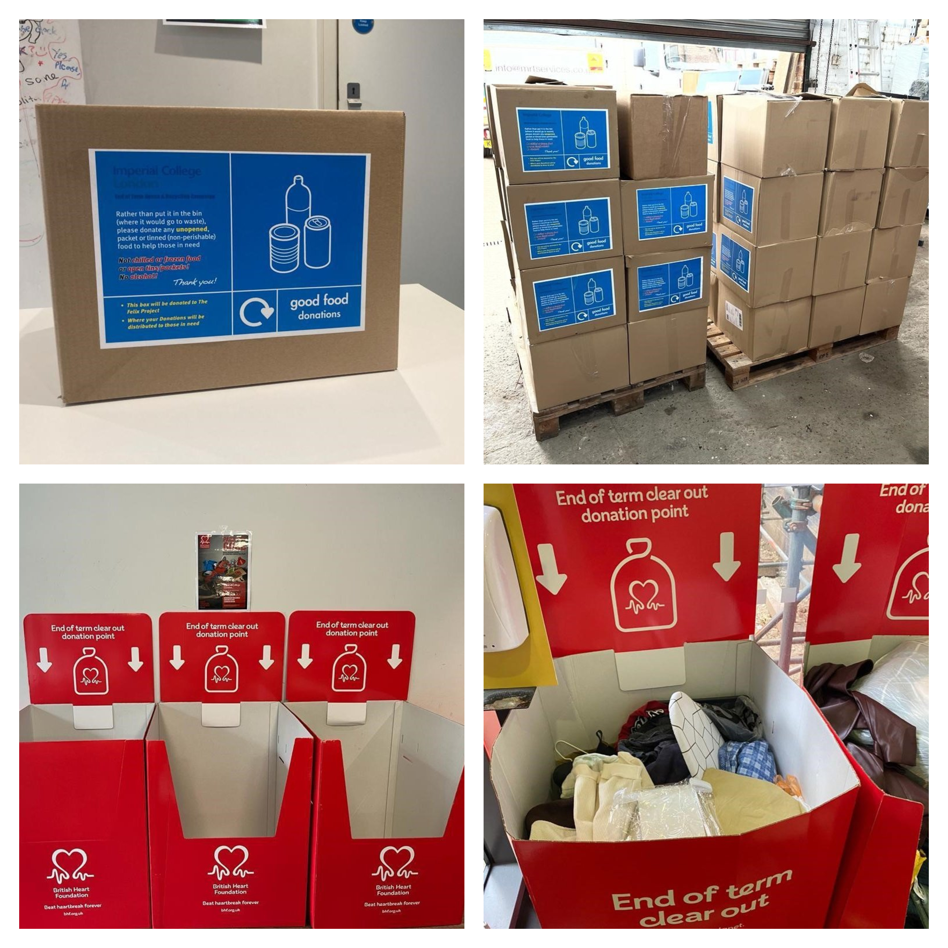 In July 2023, the Waste and Recycling team supported student departures from Halls of Residence. The team collected a record 2.1 tonnes of food donations for the Felix Project, a London-based foodbank, as part of their scheme in student kitchens. The British Heart Foundation received clothes donations and for the first time we worked with Better Reuse, who take used bedding, pillows and similar, which would otherwise go to landfill.