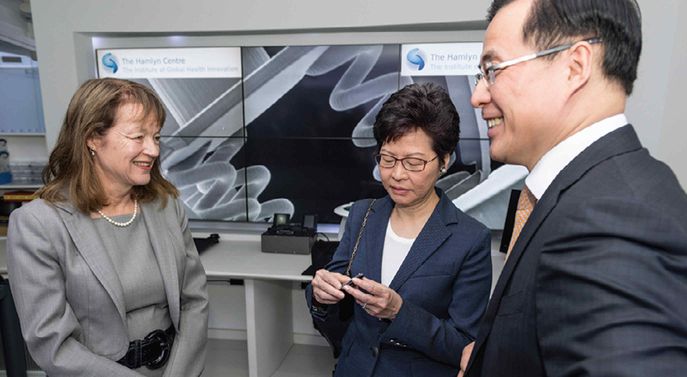 Precision Robotics is based on research at Imperial’s Hamlyn Centre for Robotic Surgery led by Professor Guang-Zhong Yang, who discussed some of his technologies with Hong Kong’s Chief Executive Carrie Lam (centre) and Imperial’s President Alice Gast (left) in December 2017.