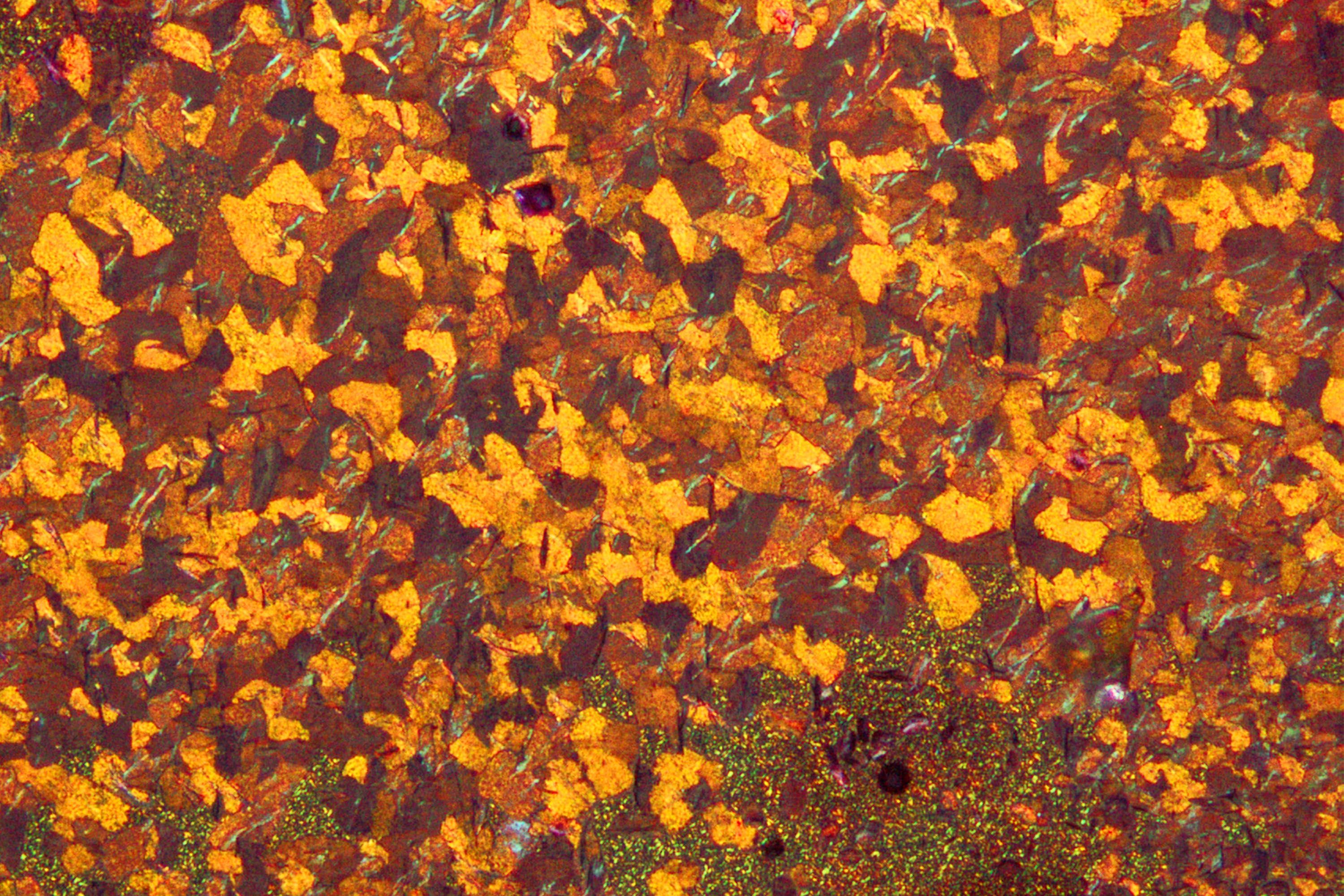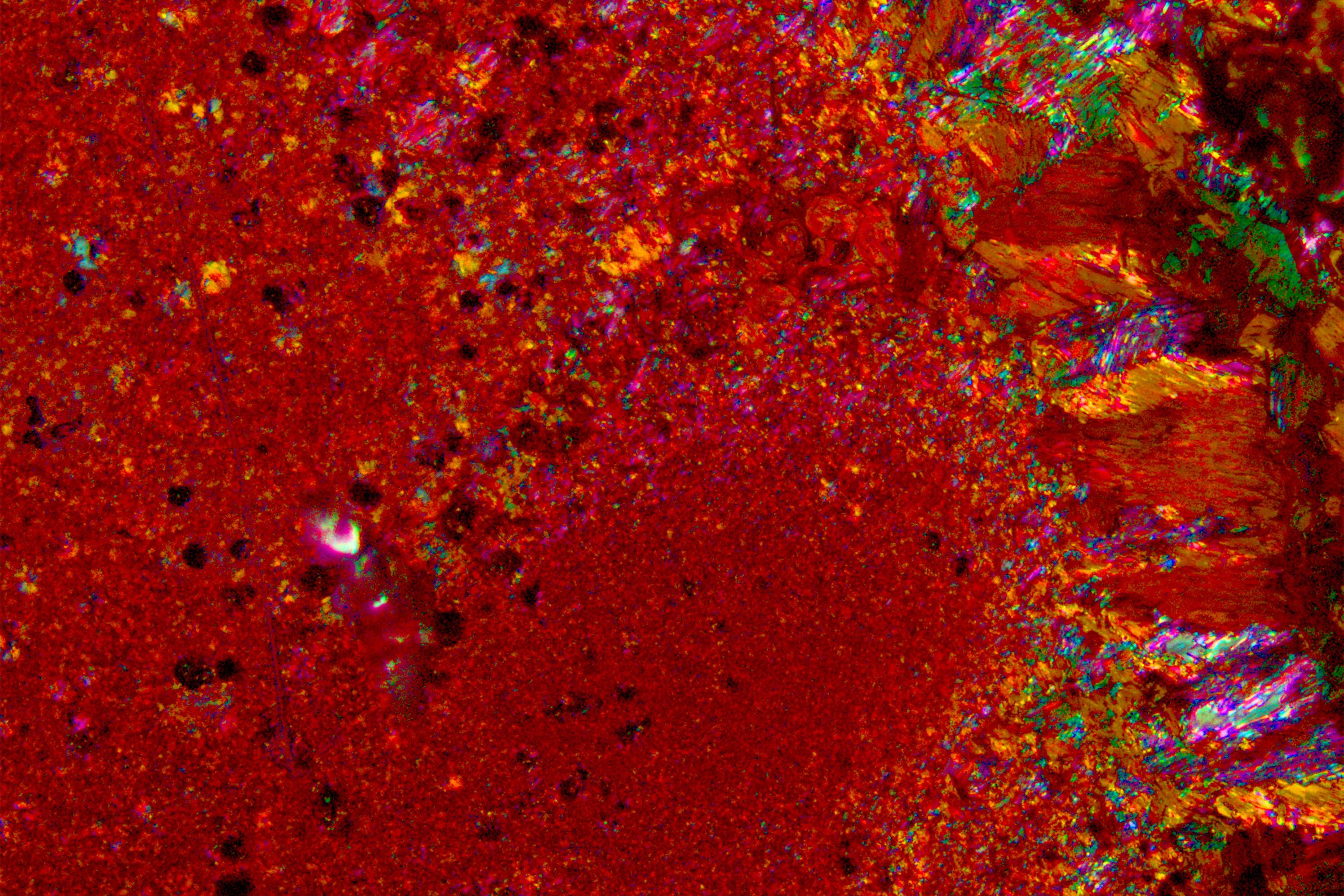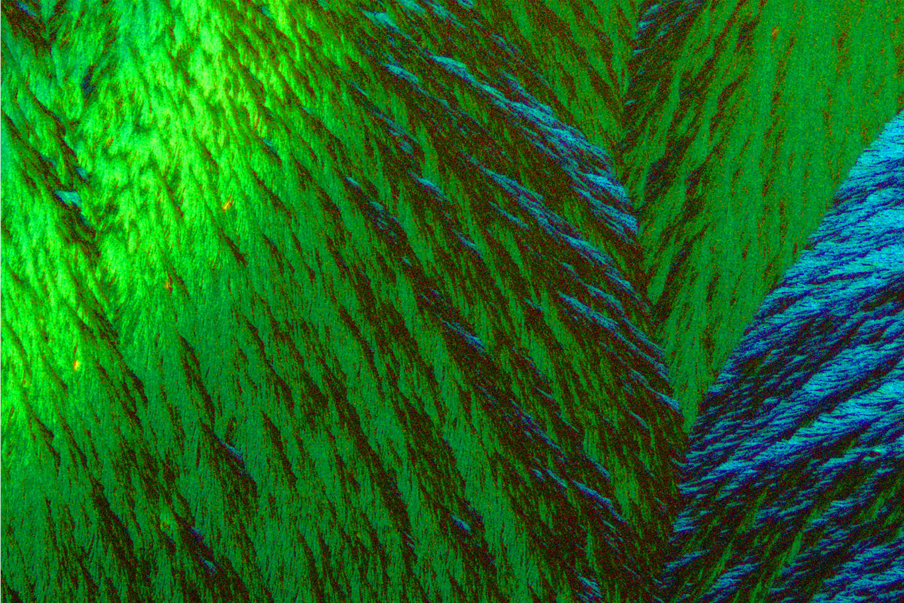 Microscope images (in festive colours) of chiral layers of carbon-based polymers for light emitting diodes, taken at Diamond Light Source. (Photo credit: Dr Jess Wade)