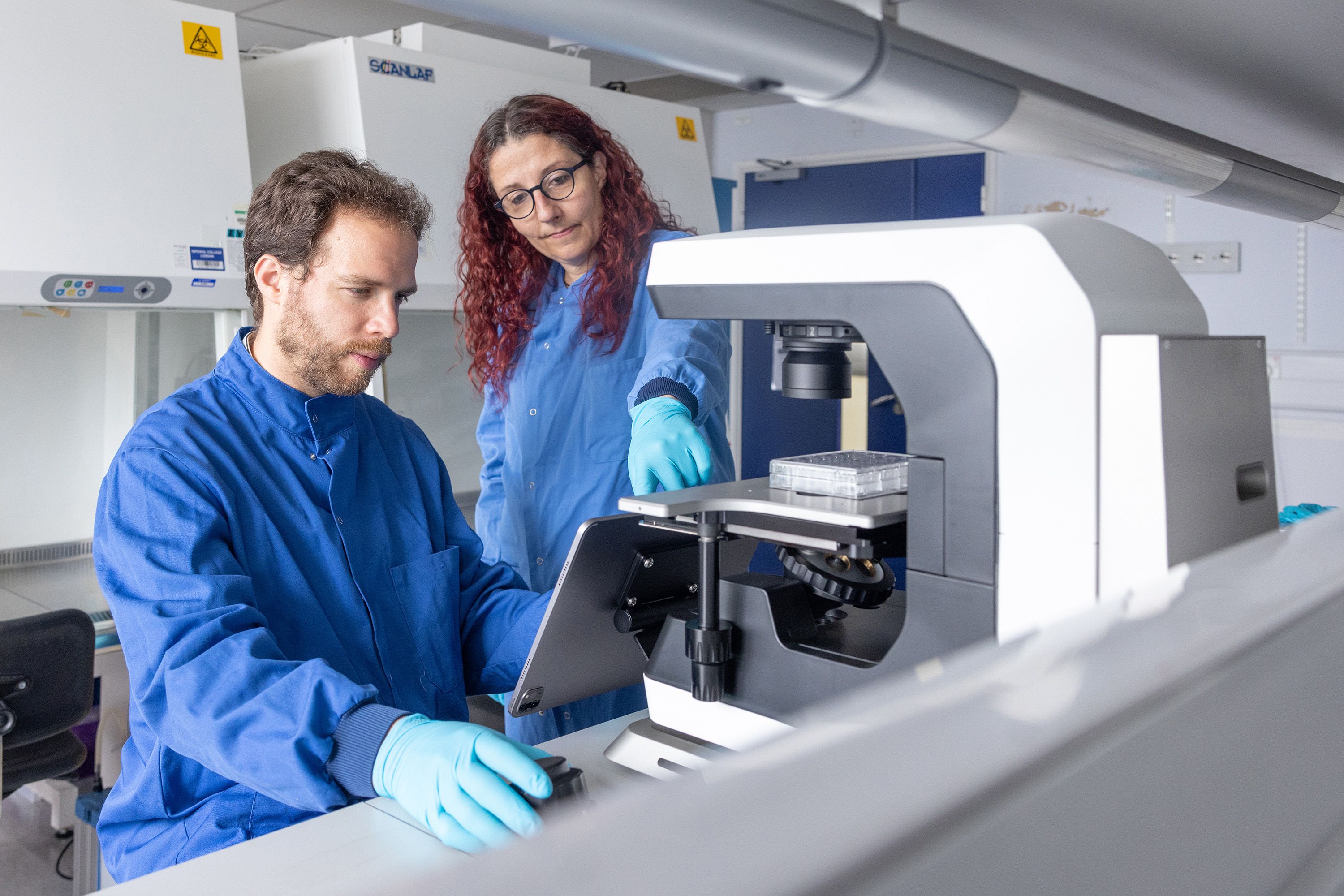 Professor Tamas Korcsmaros (left) is Co-Lead of the NIHR Imperial BRC Organoid Facility, which uses computational and experimental approaches to study signalling networks in the gut. Also pictured (right): visiting researcher Dr Isabelle Hautefort (Photo credit: Thomas Angus)
