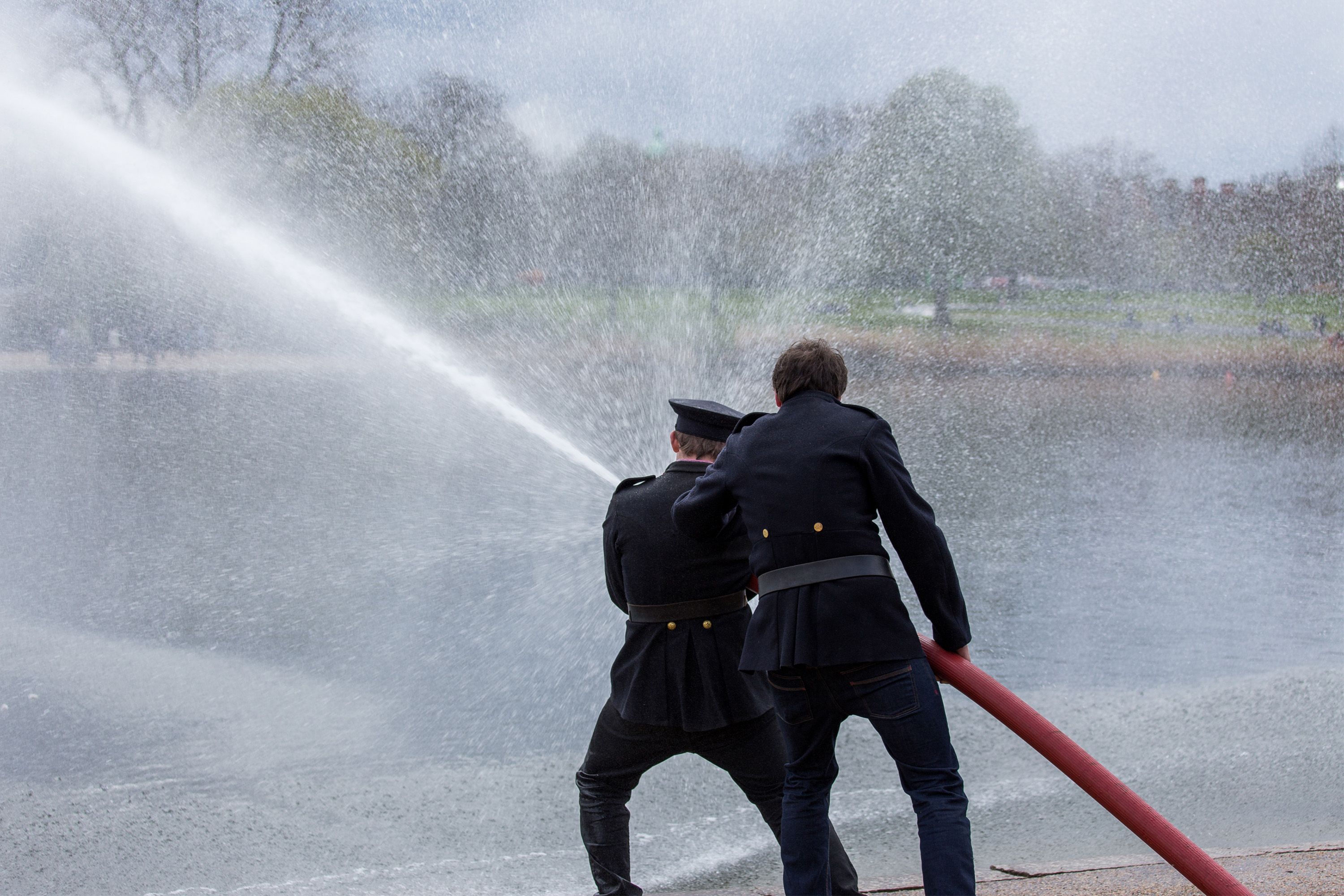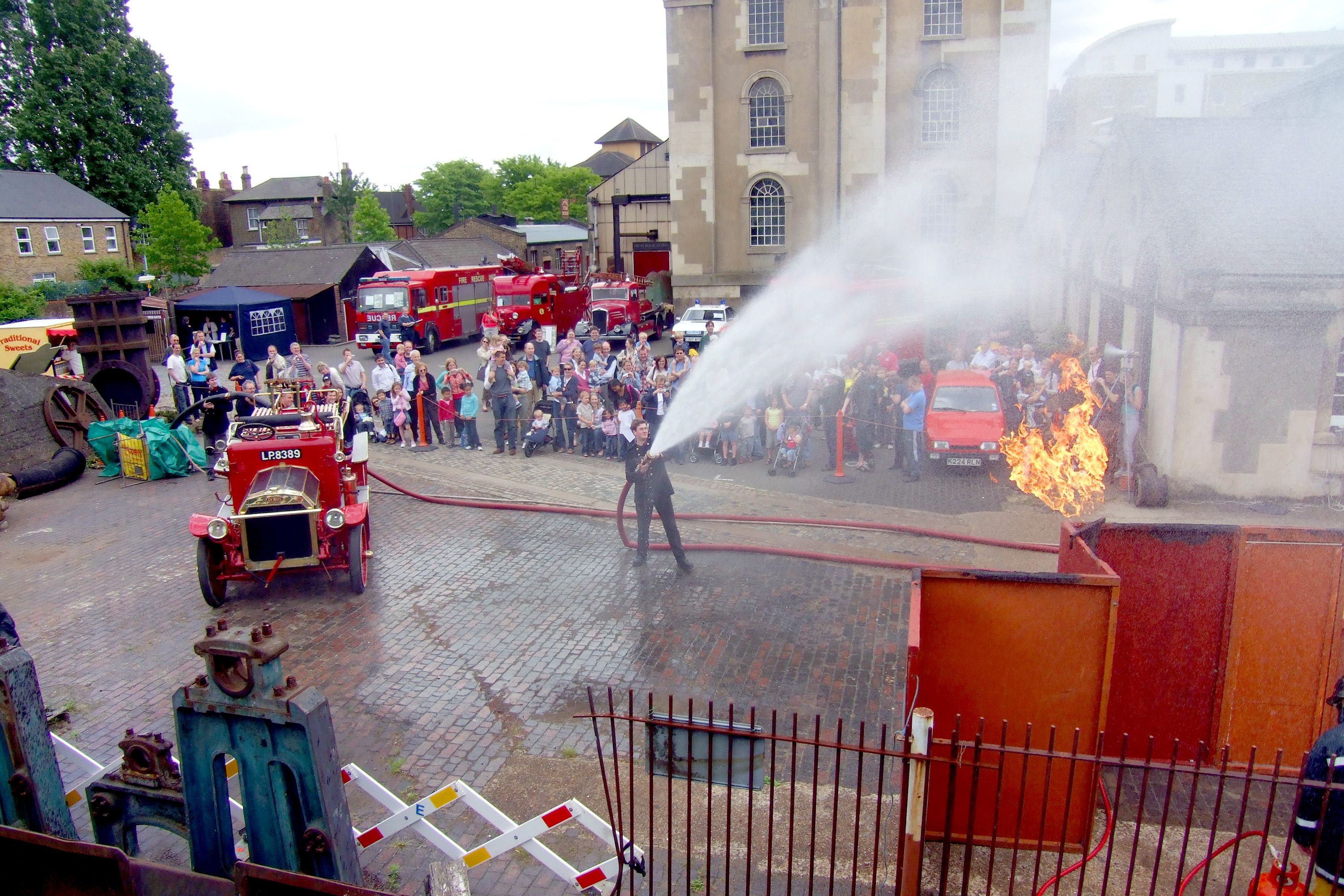 Students demonstrating the fire extinguishing capabilities of Jezebel, a 1916 Dennis fire engine, which is maintained by students from Imperial's Royal College of Science Motor Clubs.