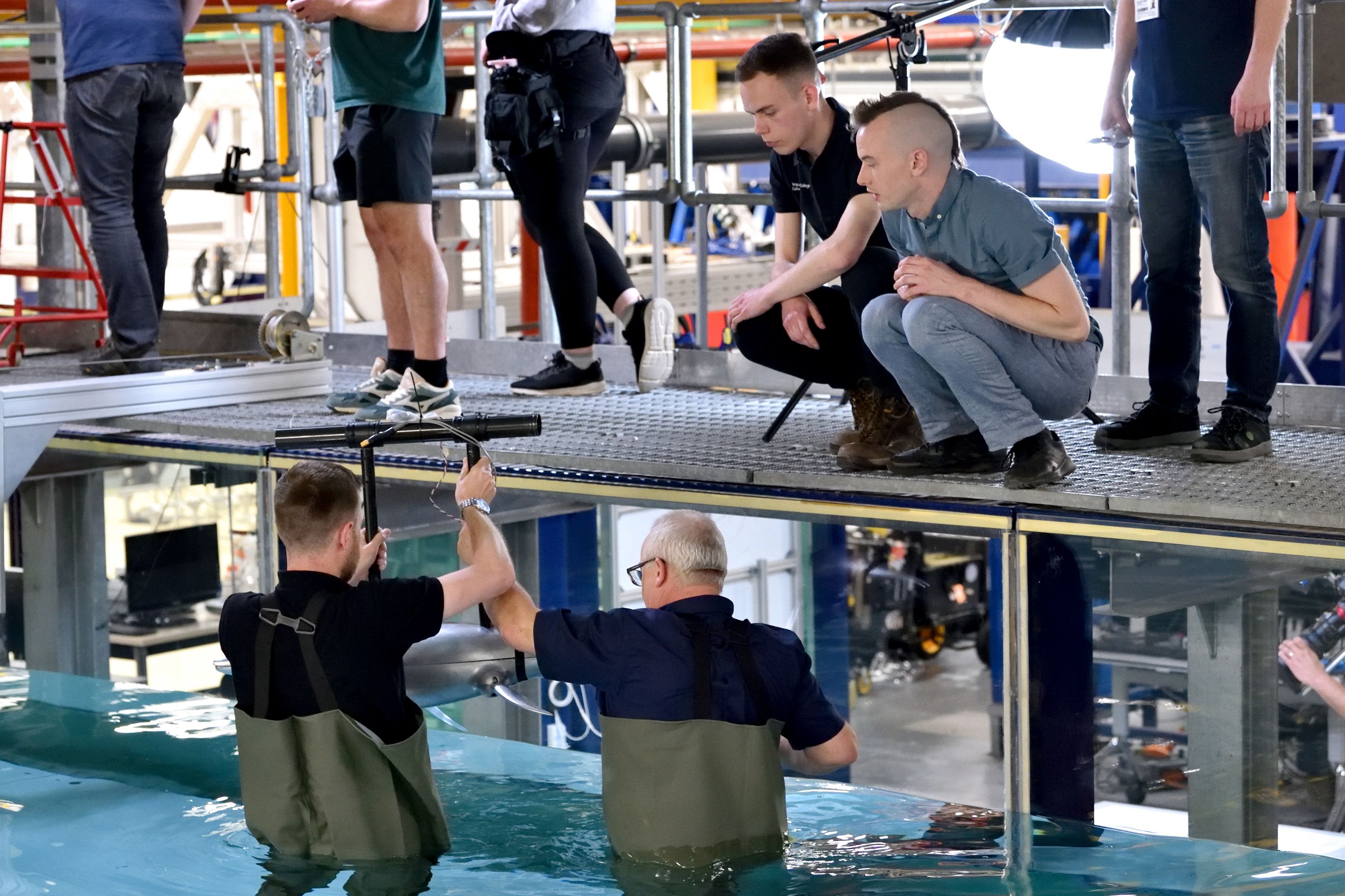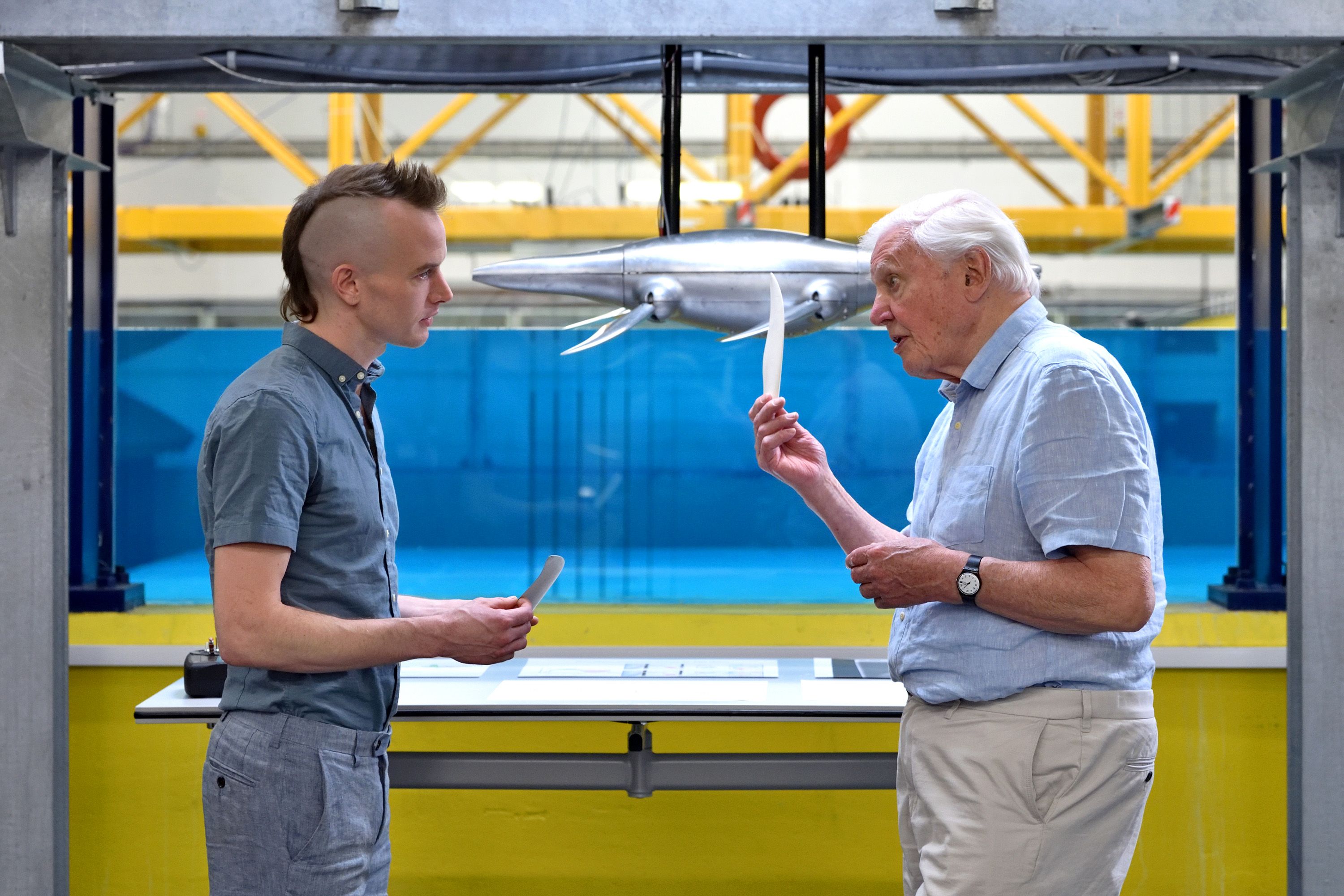 Dr Luke Muscutt (Mechanical Engineering) was interviewed by Sir David Attenborough for the documentary Attenborough and the Giant Sea Monster, which aired on New Year’s Day. The documentary featured Luke’s robotic plesiosaur, Flip. (Photo credit: Jo Mieszkowski)