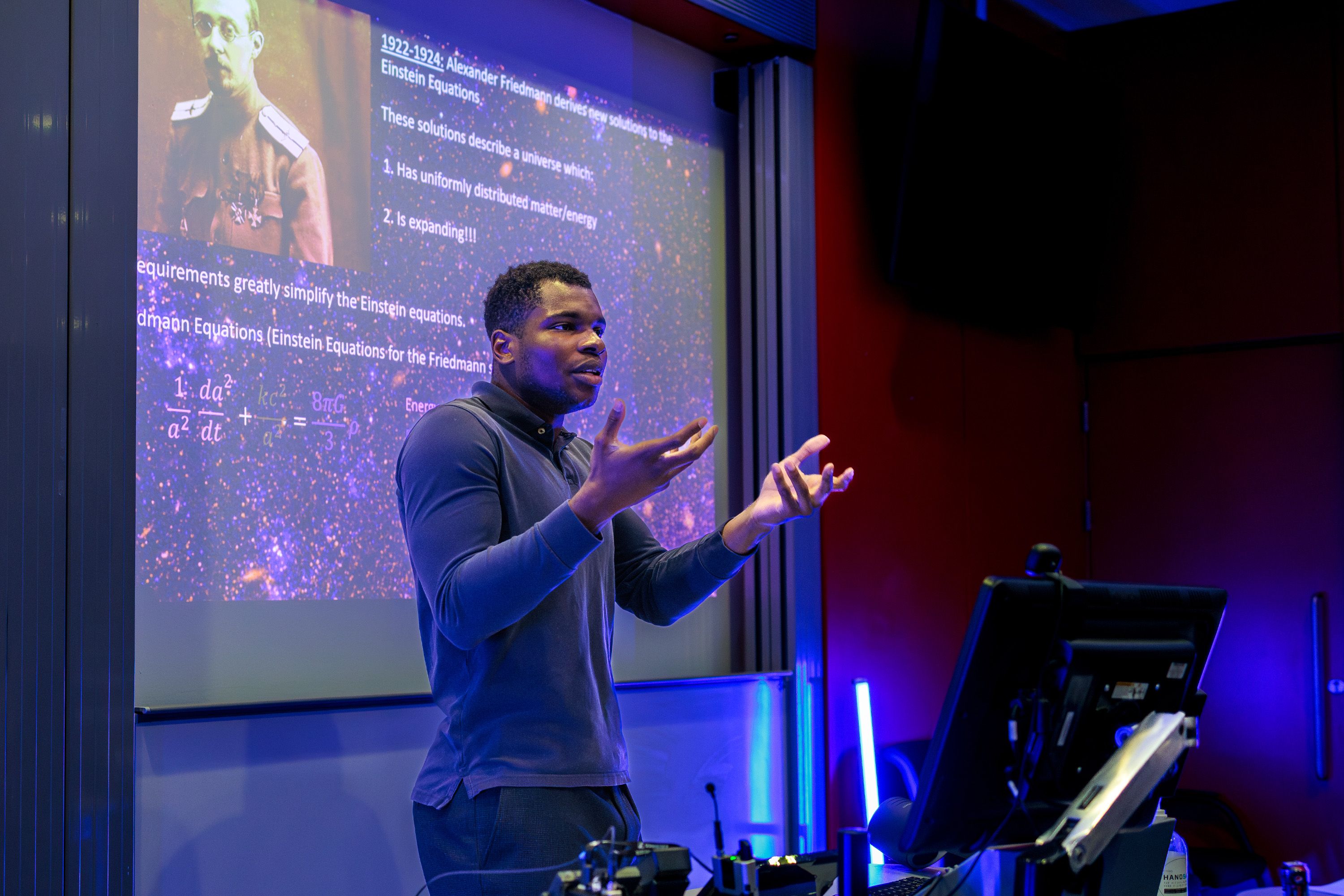 Imperial Lates: Space explored the wonders of the cosmos in an evening of martian merriment and space experiments. Pictured: Ramond Isichei, PhD student in Theoretical Physics. (Photo credit: Brendan Foster)