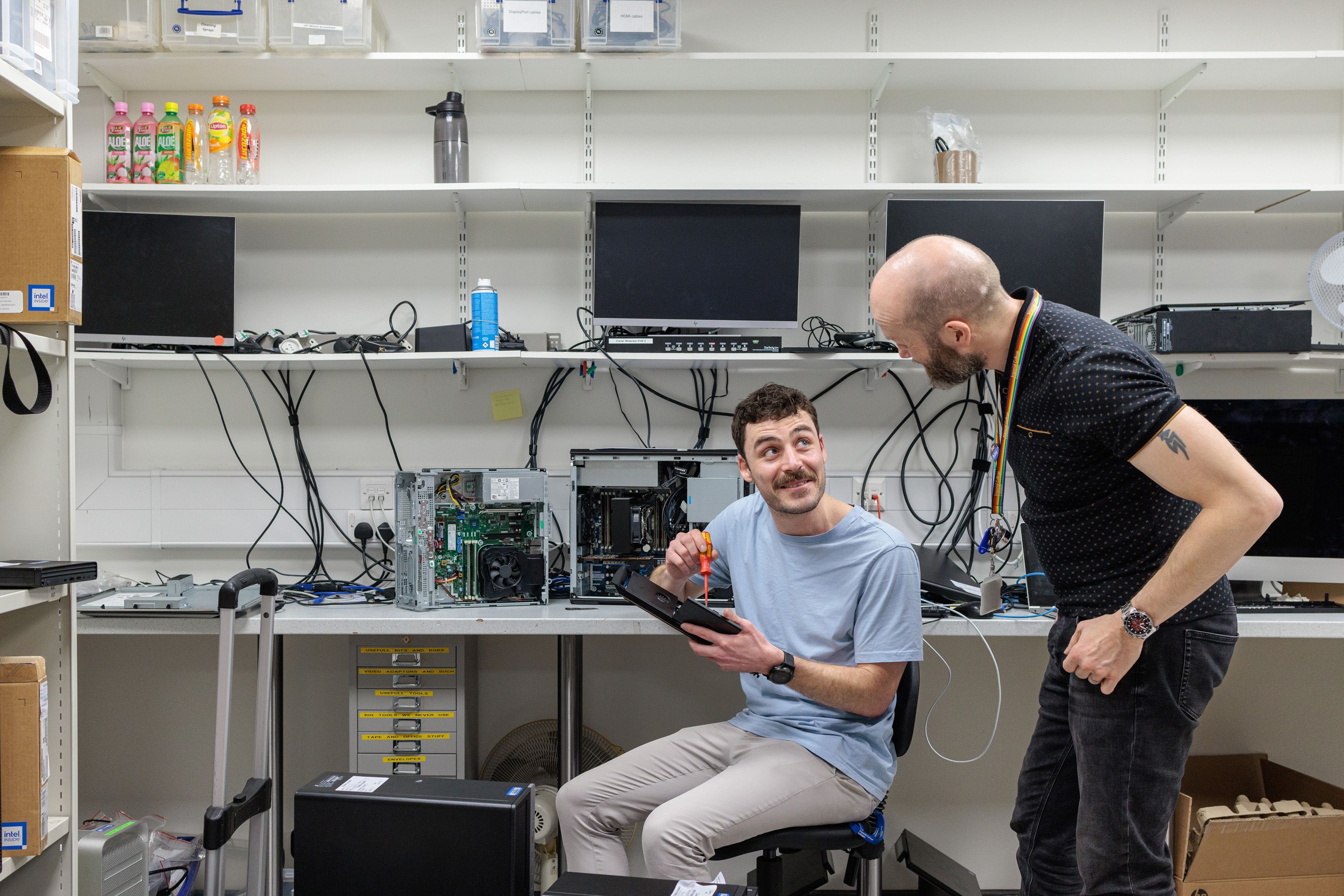 The Digital Work Place and End User Computing teams in ICT support flexible working and learning to staff and students by providing the technology to make work and study easier. L: Neil Hanham, Digital Workplace Lead, R: Alex Twist, End User Computing. (Photo by Brendan Foster)