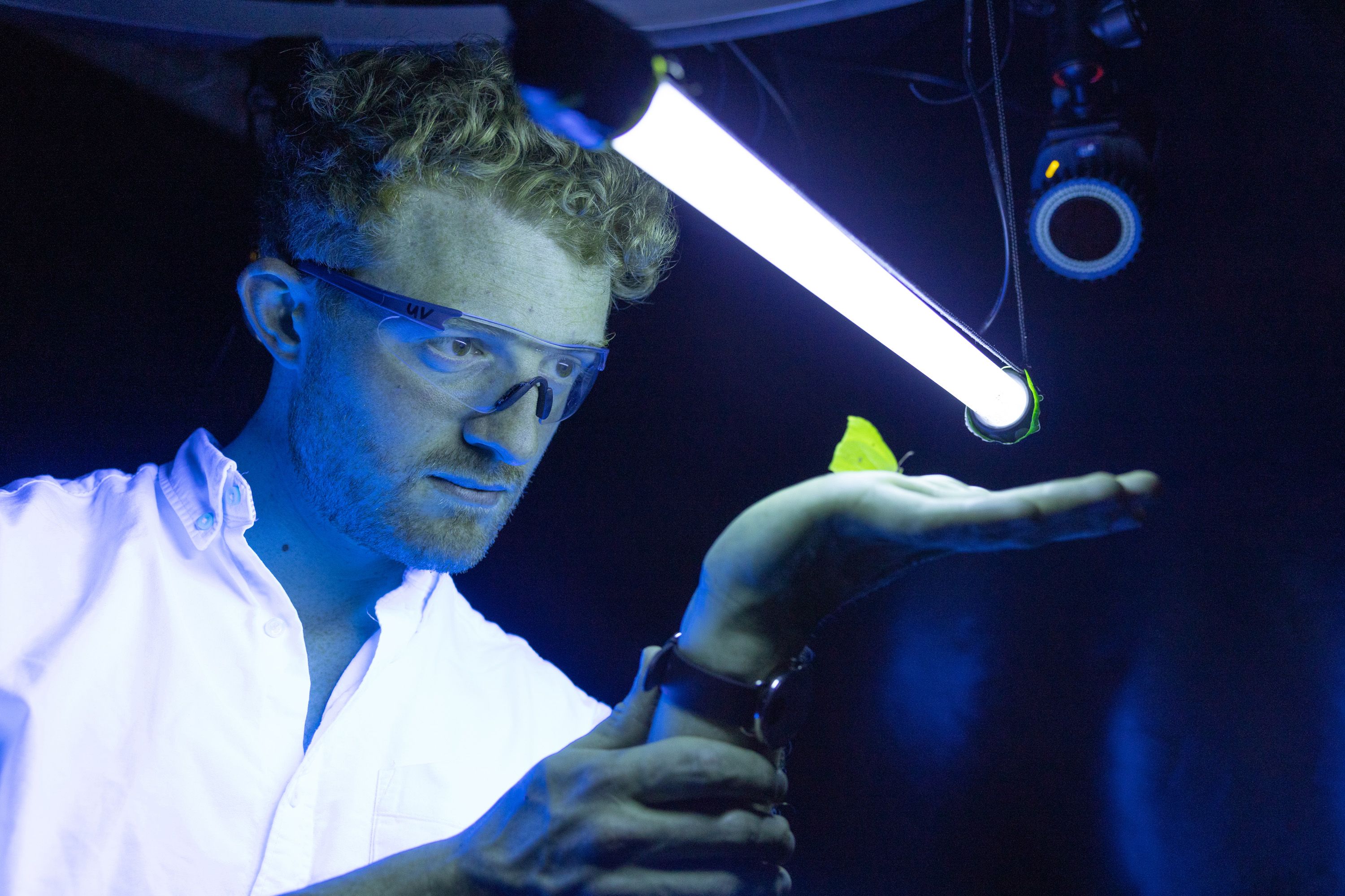 Research Associate Dr Samuel Fabian researching why insects gather at artificial lights in the lab of Dr Huai-Ti Lin, Department of Bioengineering. The moth is a Yellow Brimstone, sometimes referred to as the ‘Harbinger of Spring’. (Photo by Thomas Angus)