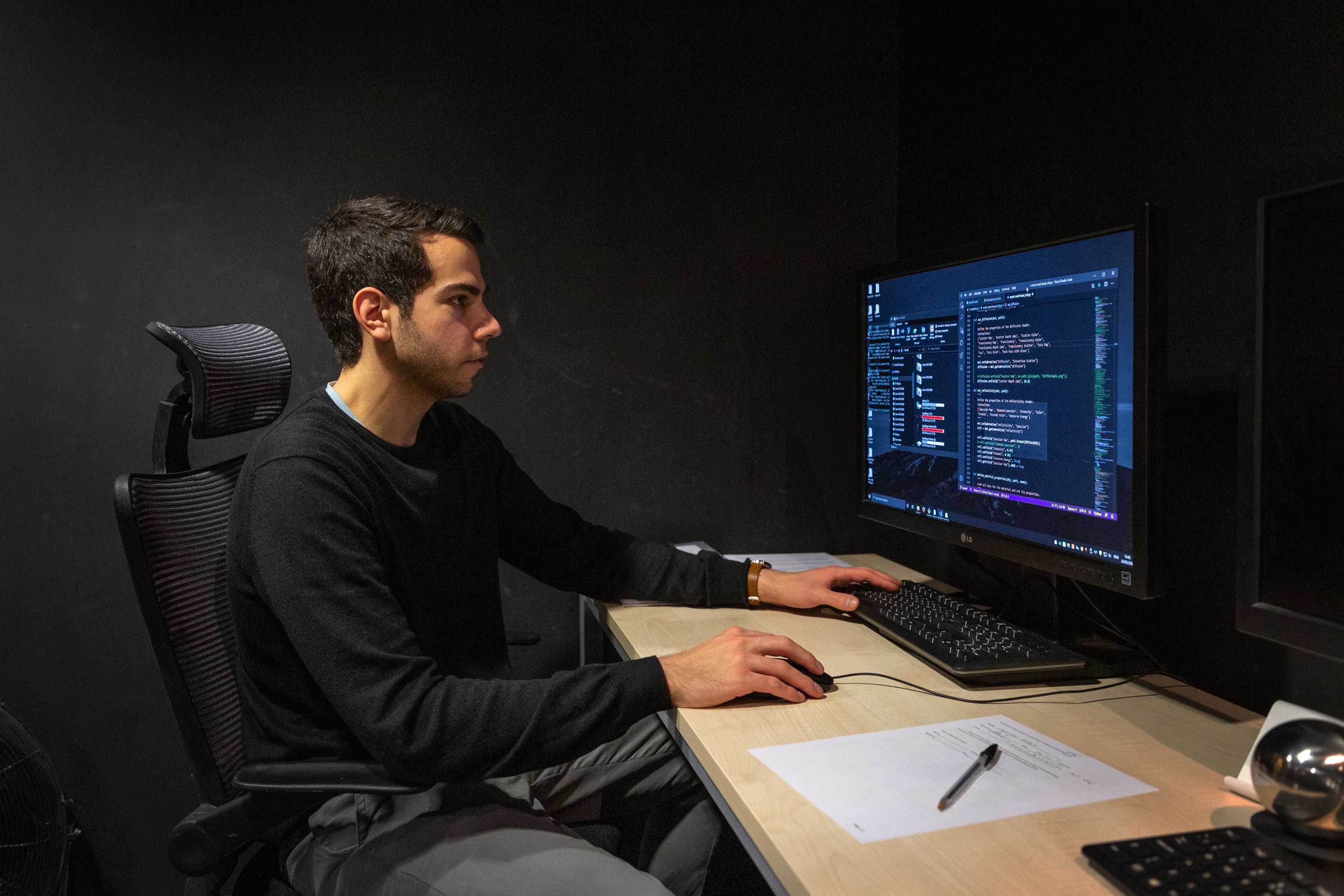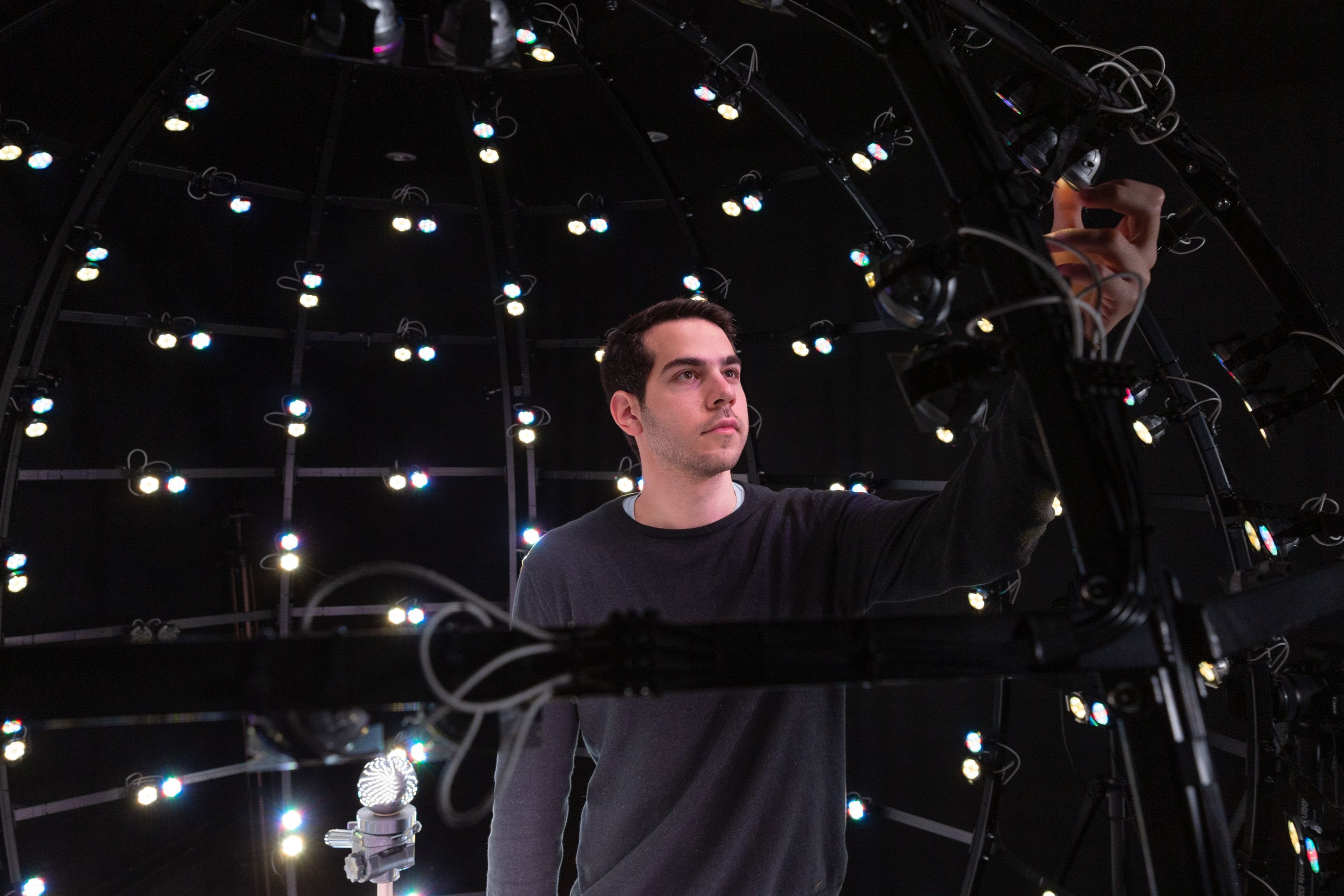 The Realistic Graphics and Imaging Group’s multispectral LED sphere in the Department of Computing consists of 168 LED lamps. It can be employed for controlled appearance measurements as well as realistic lighting reproduction. Pictured: Alexandros Lattas, PhD student. (Photo credit: Thomas Angus)