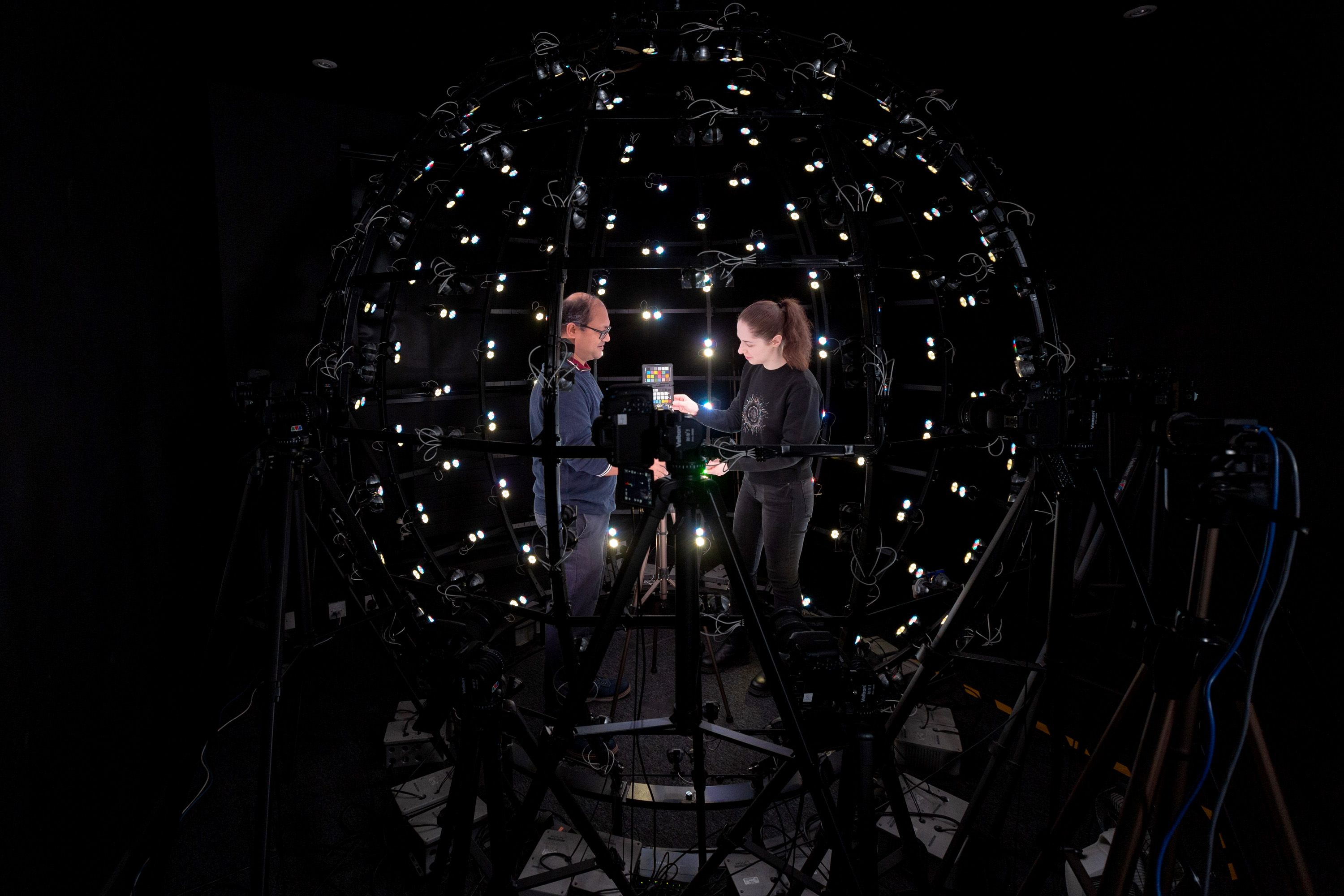 The Realistic Graphics and Imaging Group’s multispectral LED sphere in the Department of Computing consists of 168 LED lamps. Left: Dr Abhijeet Ghosh, Reader in Graphics and Imaging. Right: Yuliya Gitlina, PhD student. (Photo credit: Thomas Angus)