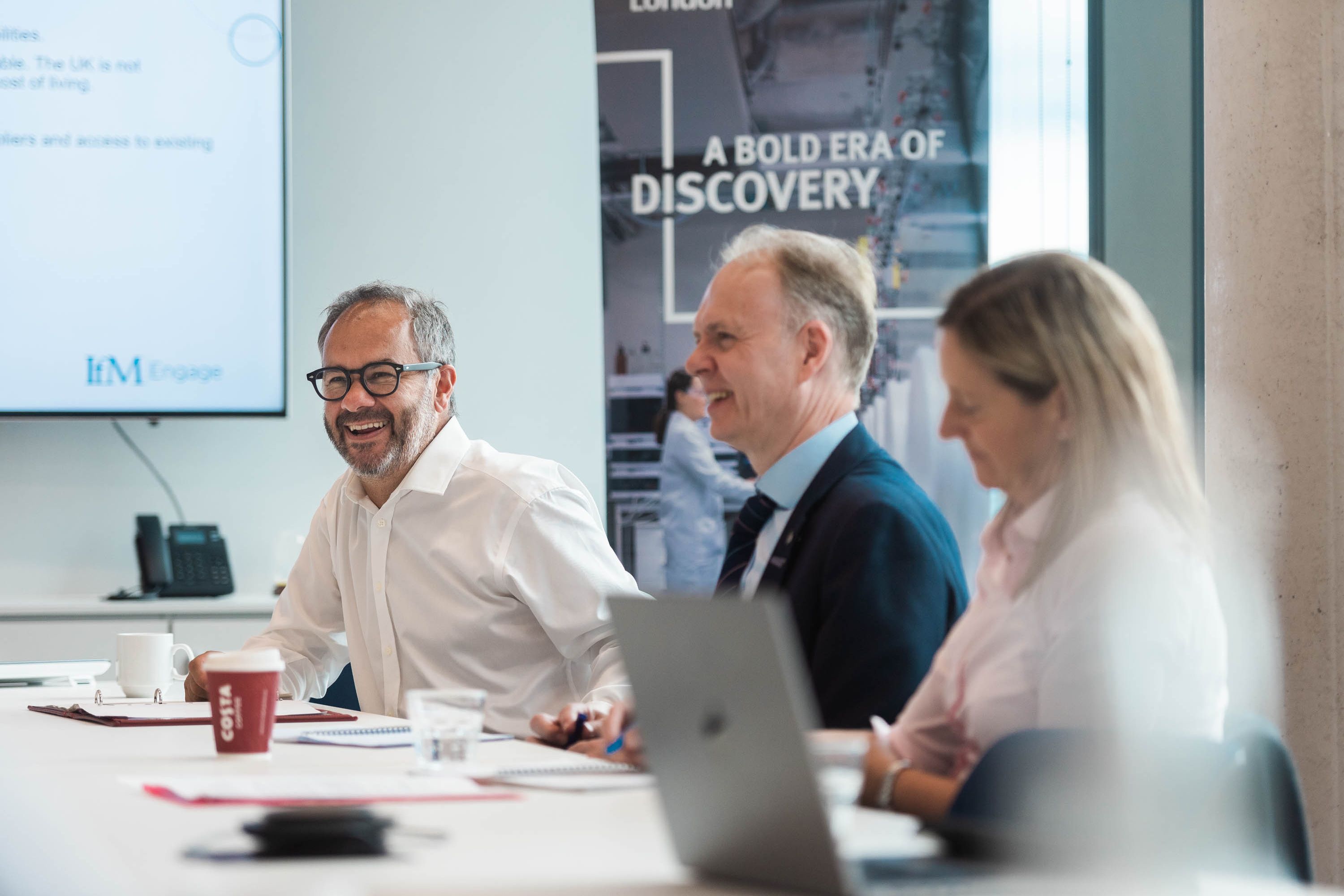 Minister for Tech and the Digital Economy Paul Scully MP (centre) held the Government’s first Semiconductor Advisory Panel meeting at Imperial’s White City Campus. Also pictured: Dr Jalal Bagherli (left); Dr Peter Petrov. (Photo credit: James Tye)