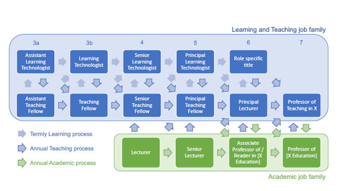 The diagram below represents the career progression opportunities through the various pathways within the Learning & Teaching job family as well as the educational research pathway in the Academic job family.