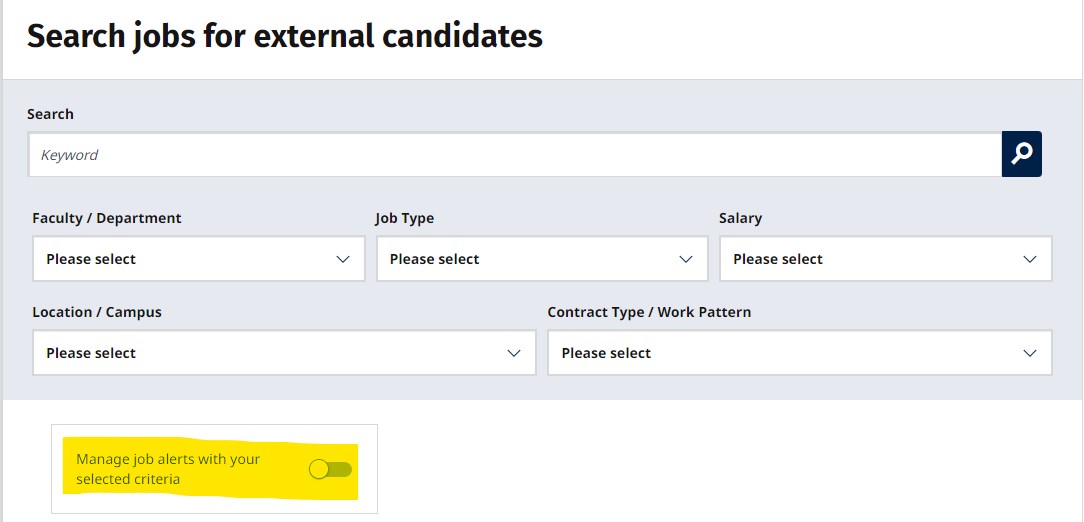 - To do this, go to the jobs page (https://www.imperial.ac.uk/jobs/), insert any relevant key words in to the search bar at the top and set any filters that are relevant to the job you are looking for and press the search button. From there, click the ‘Manage job alerts with you selected criteria’ button highlighted in yellow below to set the frequency and duration before creating the alerts.