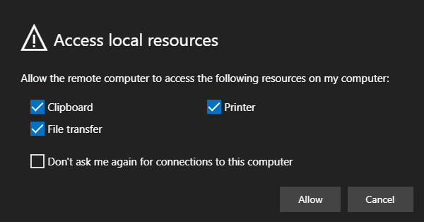 3. You will be asked if you want to share your clipboard and printer from your local desktop. Choose what is most appropriate to you.