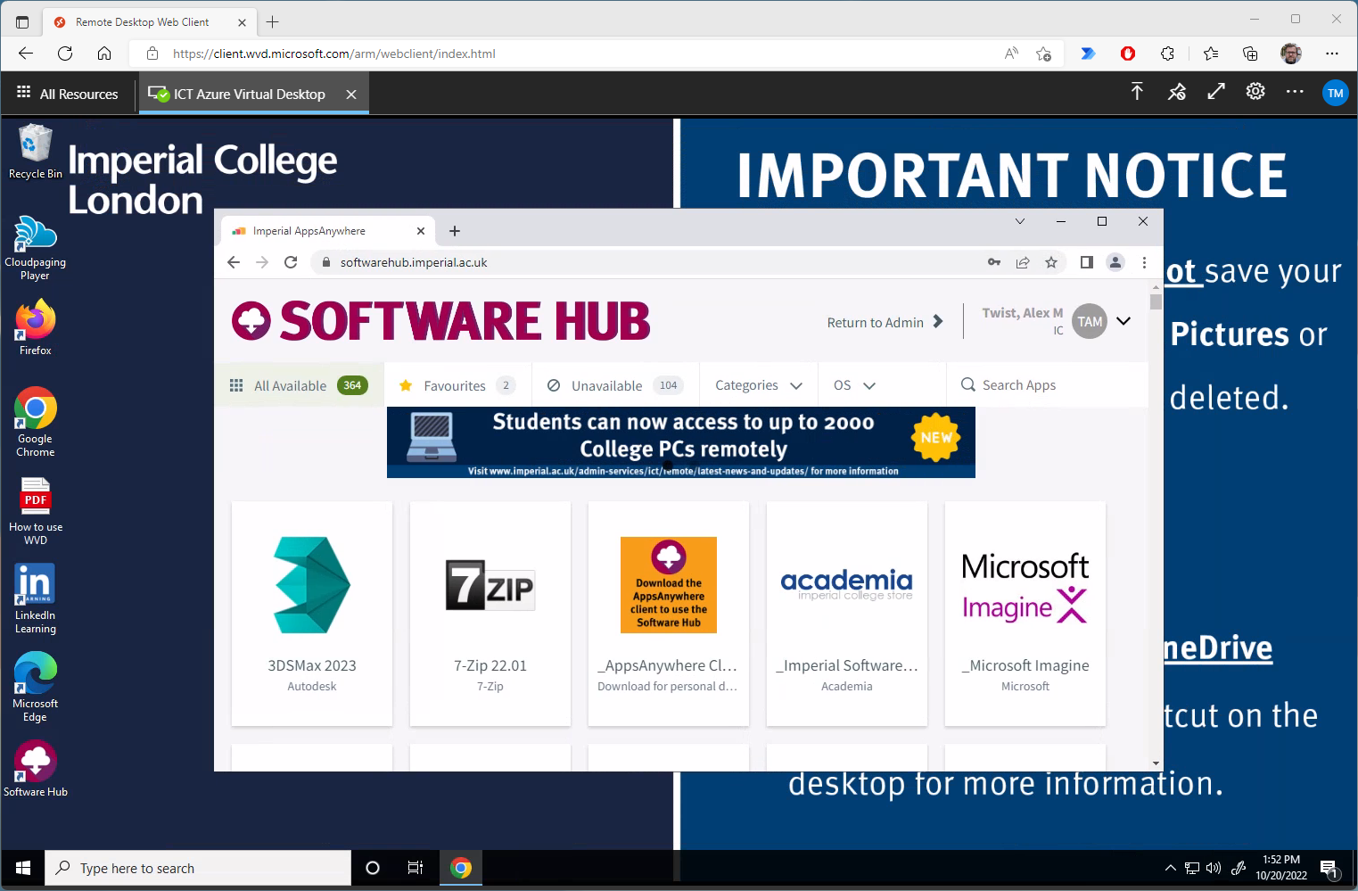 Azure Virtual Desktop (AVD) is a Microsoft cloud service that allows Imperial to create 'cloud computers' that students can access using their personal device and an internet connection. These cloud-based computers are designed to replicate the functionality of campus cluster computers used for teaching. The platform also allows students to use Macs and Linux to access a Windows Desktop and run applications that are not compatible with their own devices.