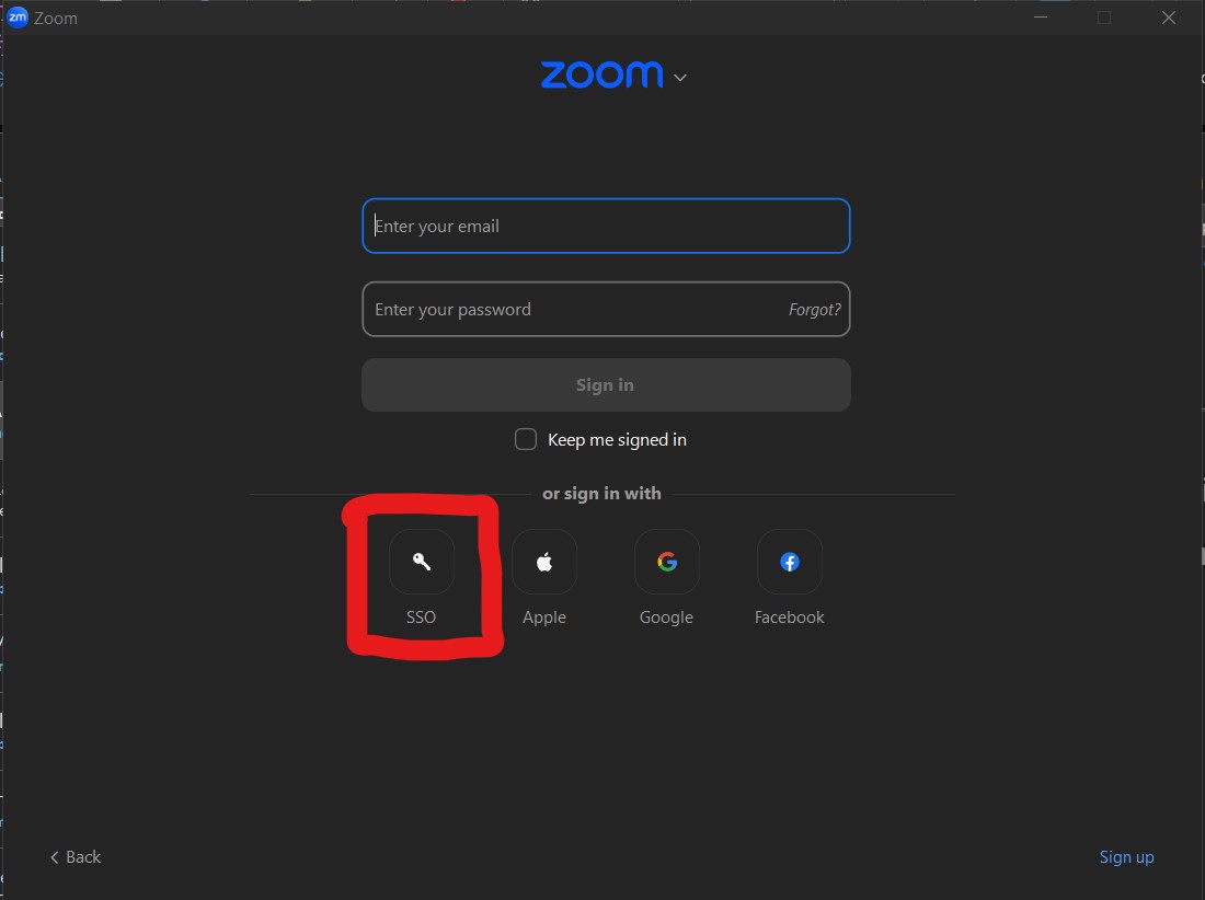2. Once installed, open up the Zoom client and select Sign In and then Sign in with SSO.