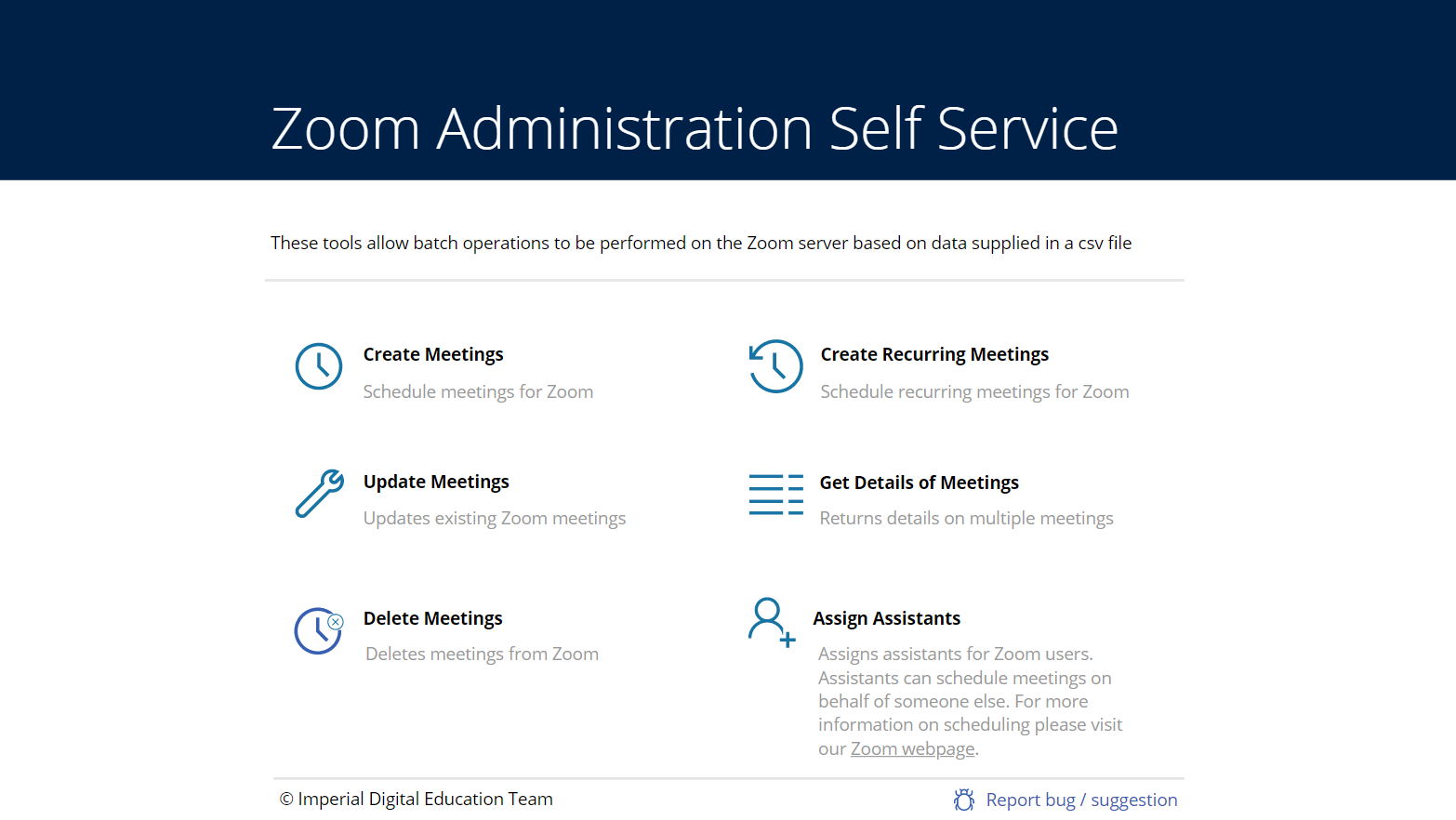 The Digital Education Platforms team have developed a self service application that enables Faculty Learning Technologists in departments that use Zoom, to manage many aspects of Zoom meetings in bulk by submitting csv files.