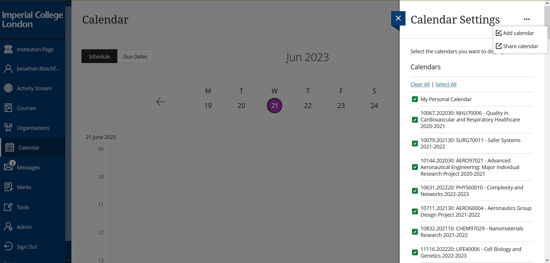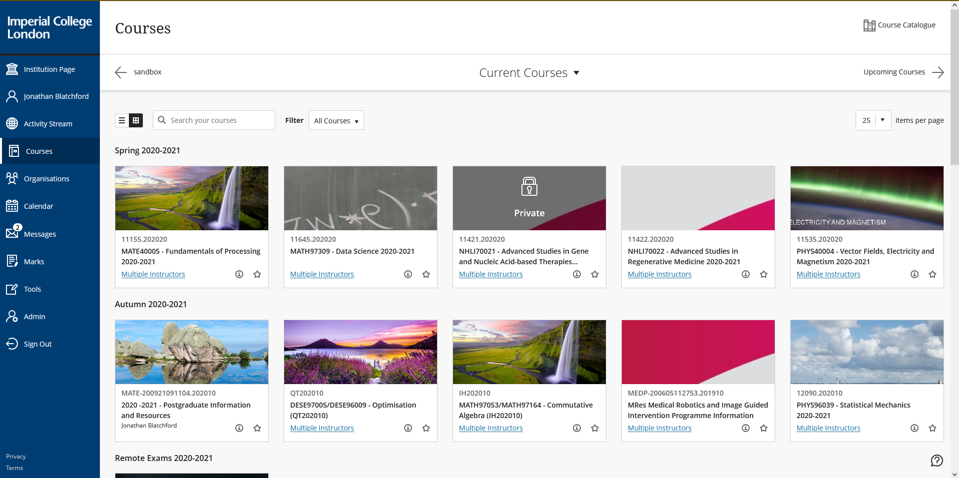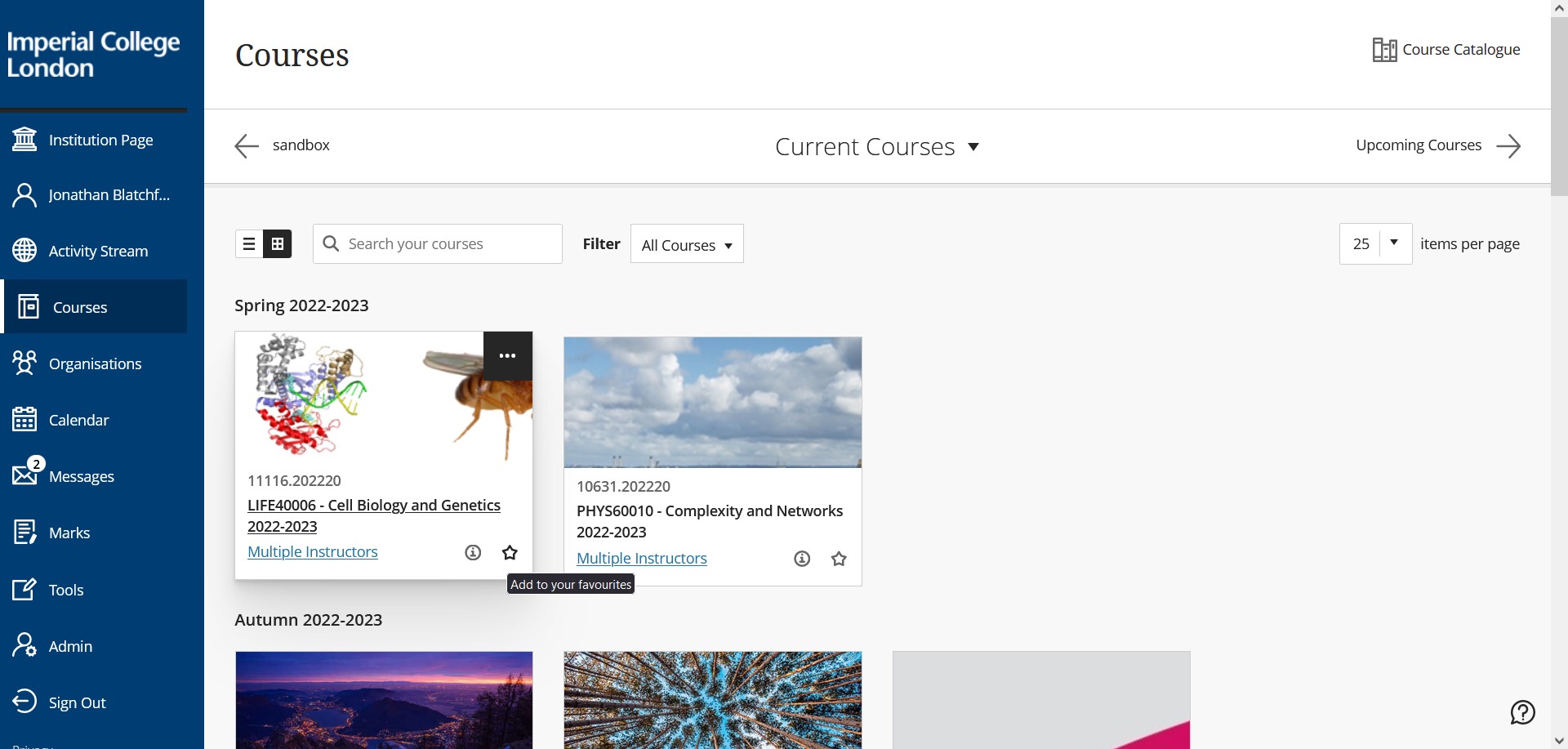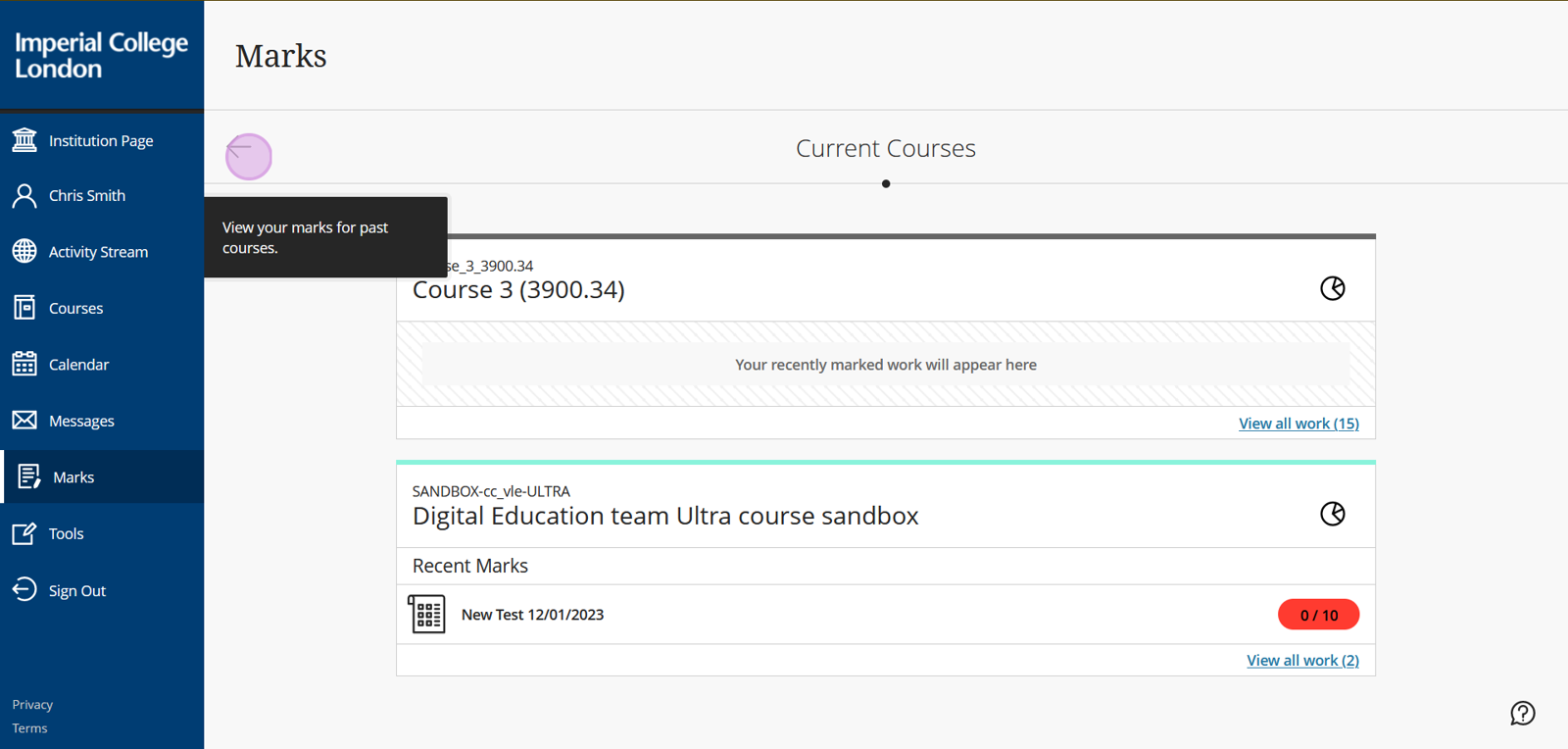 - Open the drop-down menu in the middle of the page and navigate between current courses and a previous semester or year.